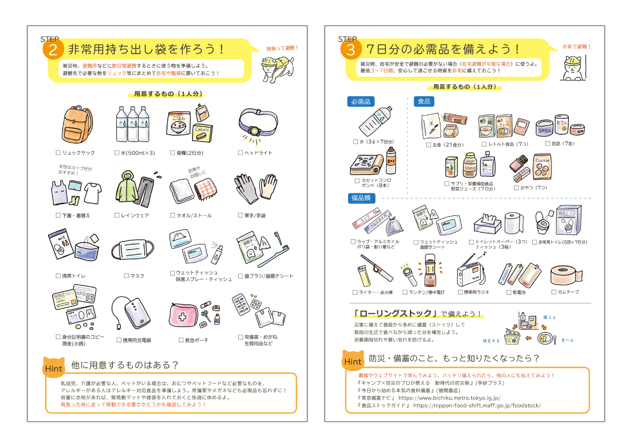 そこで、まだ備えられていない人を対象に、気軽に「防災・備蓄」を始めるきっかけとなるフリーペーパーのようなパンフレットを作成しようと考えました。幅広い層が気軽に手に取りやすいようネコのキャラクターを起用し、圧迫感の少ないシンプルなイラストレーションを用いて、必要なアイテムは実際に店舗で商品を探しやすいように少しリアルさを残して描きました。また、1〜3ステップで「短期的な備え」から「長期の備え」へステップアップしていけるようにページを構成しました。
