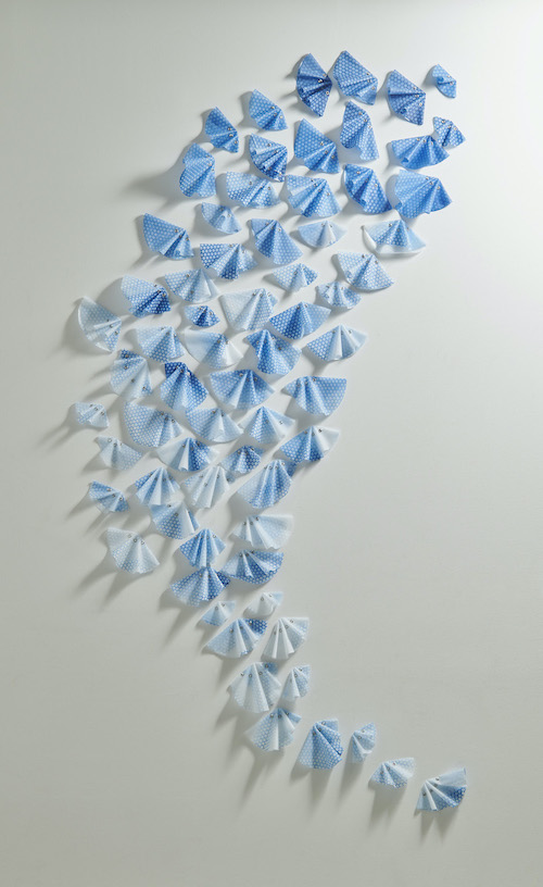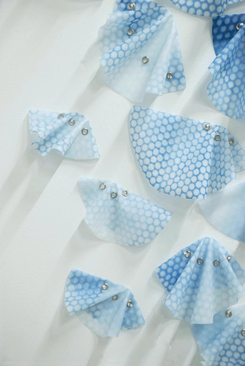 大きい魚のような、小さい魚の群れのような。魚じゃない別のもののような。見る人によってそれぞれ答えがある作品。波のようなひだによって作品周辺に生まれる影の様子も一緒に見て頂きたい。