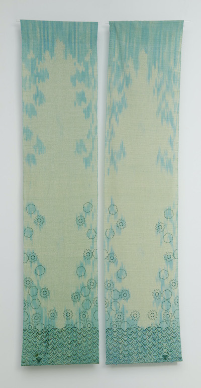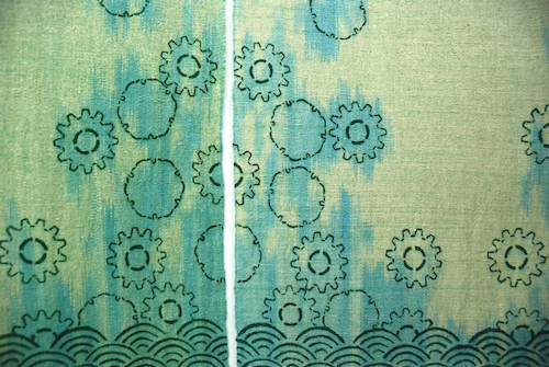 物事は善いことも悪いことも不可逆性を抱えて繰り返し、変容していると思います。左右上下に繋がる絣模様と丸い紋様で繰り返しを表現しました。モチーフには古来のもの(青海波、雪輪)と近代的なもの(歯車、Wi-Fiマーク)、素材は化学染料で出した柔らかい色と自然素材の絹を採用し、過去と現代の調和、変化や融合をイメージしました。