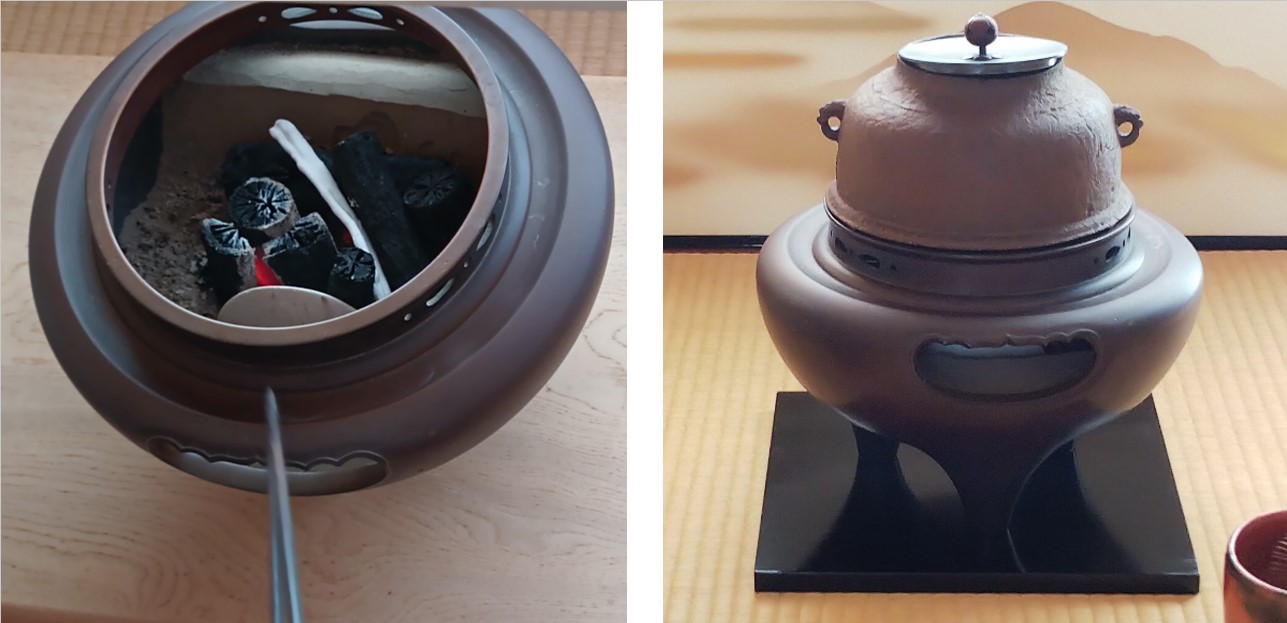 (写真1)風炉の一例。左の画像は炭をついだ直後の様子。右の画像は茶釜をかけた状態の風炉=掲載写真はすべて筆者撮影