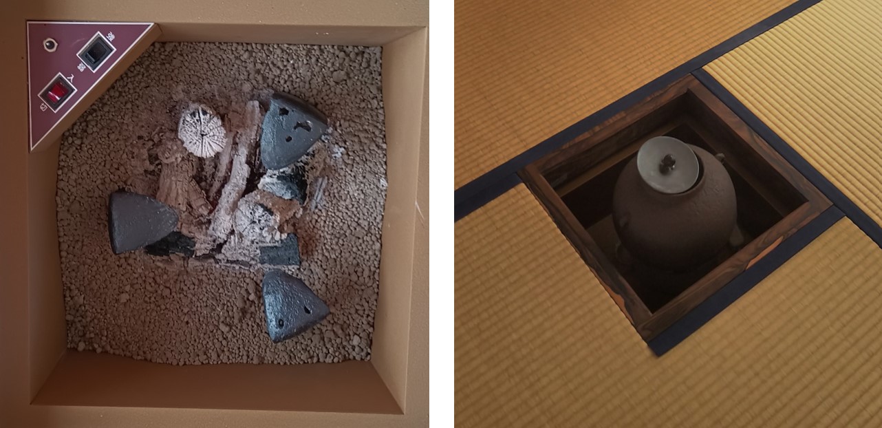 (写真2)炉の一例。左の画像は炭がほぼ燃え尽きた様子。右の画像は茶釜をかけた状態の炉