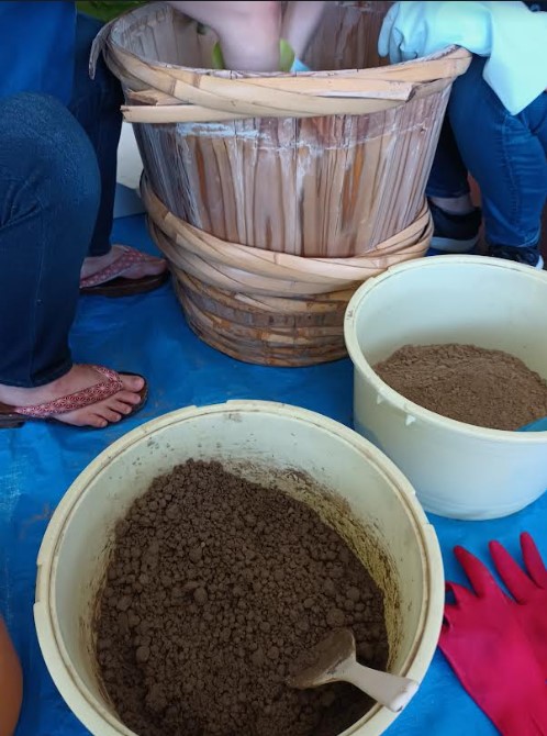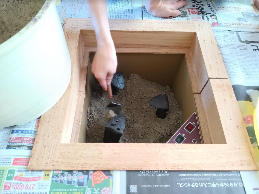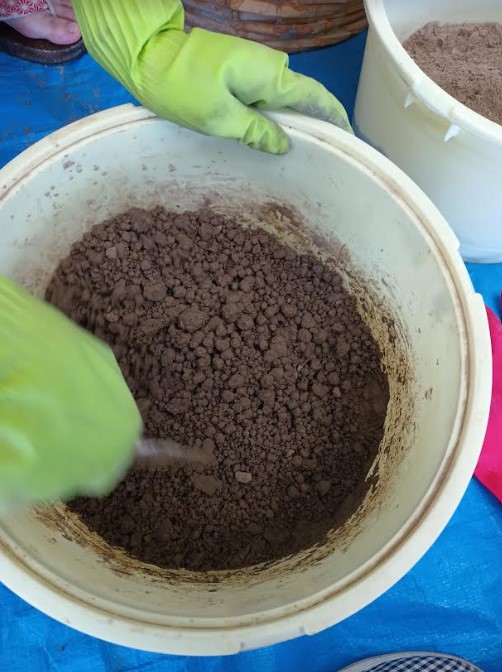 (写真4)ぬれた灰に少しずつ乾いた灰を加え、程よい状態になるまで混ぜていく