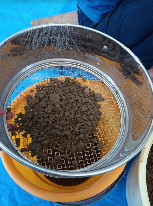 (写真5)目の粗い灰篩にかけ、篩に残った大きい塊は取り除いていく