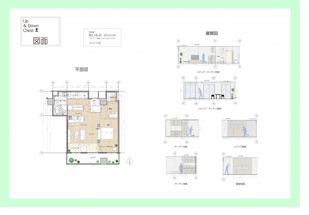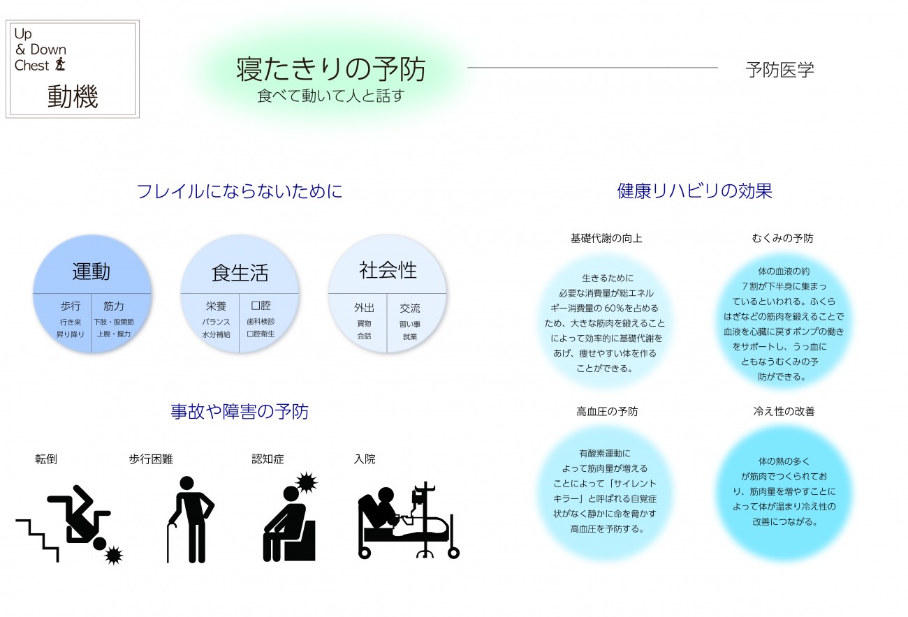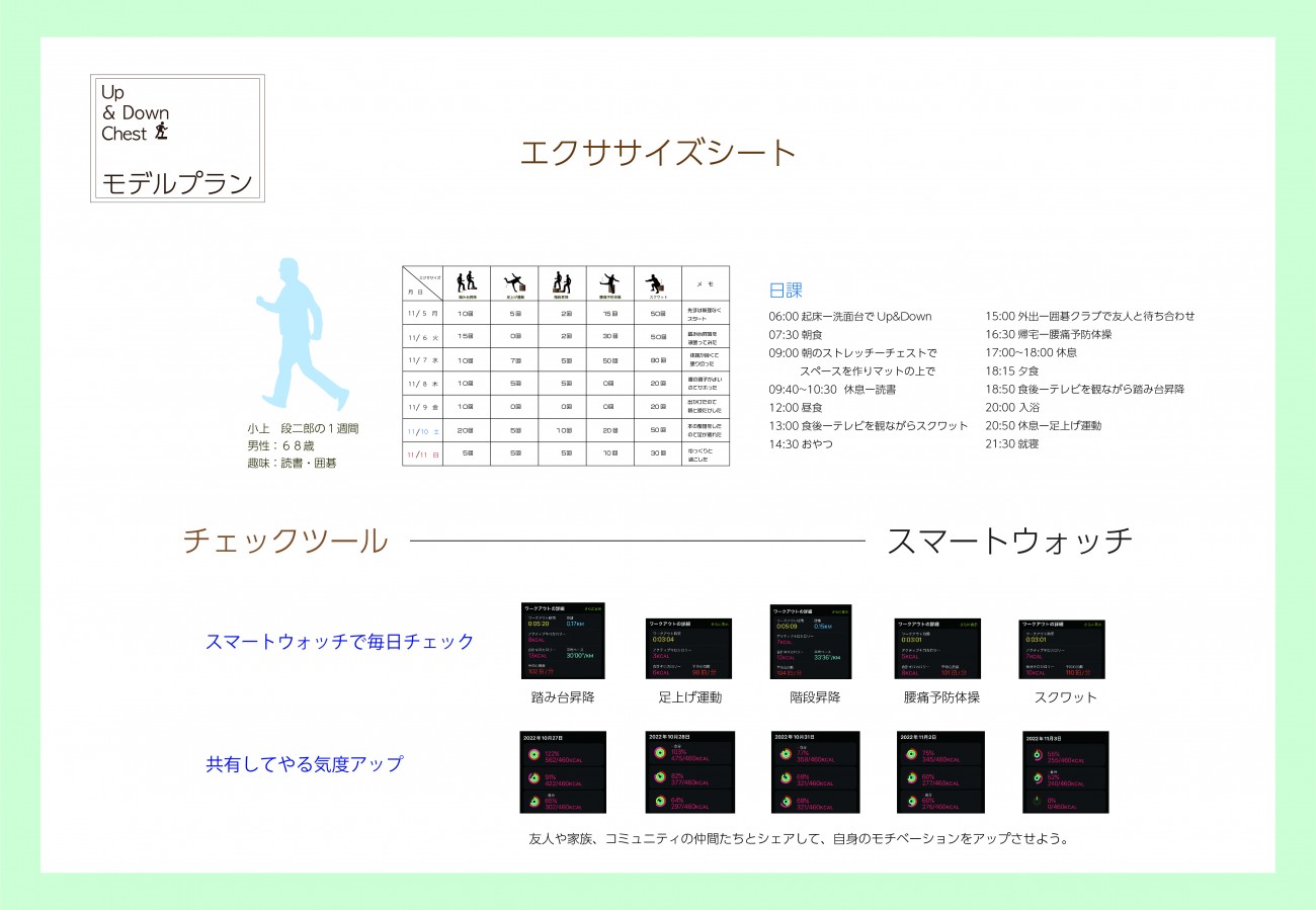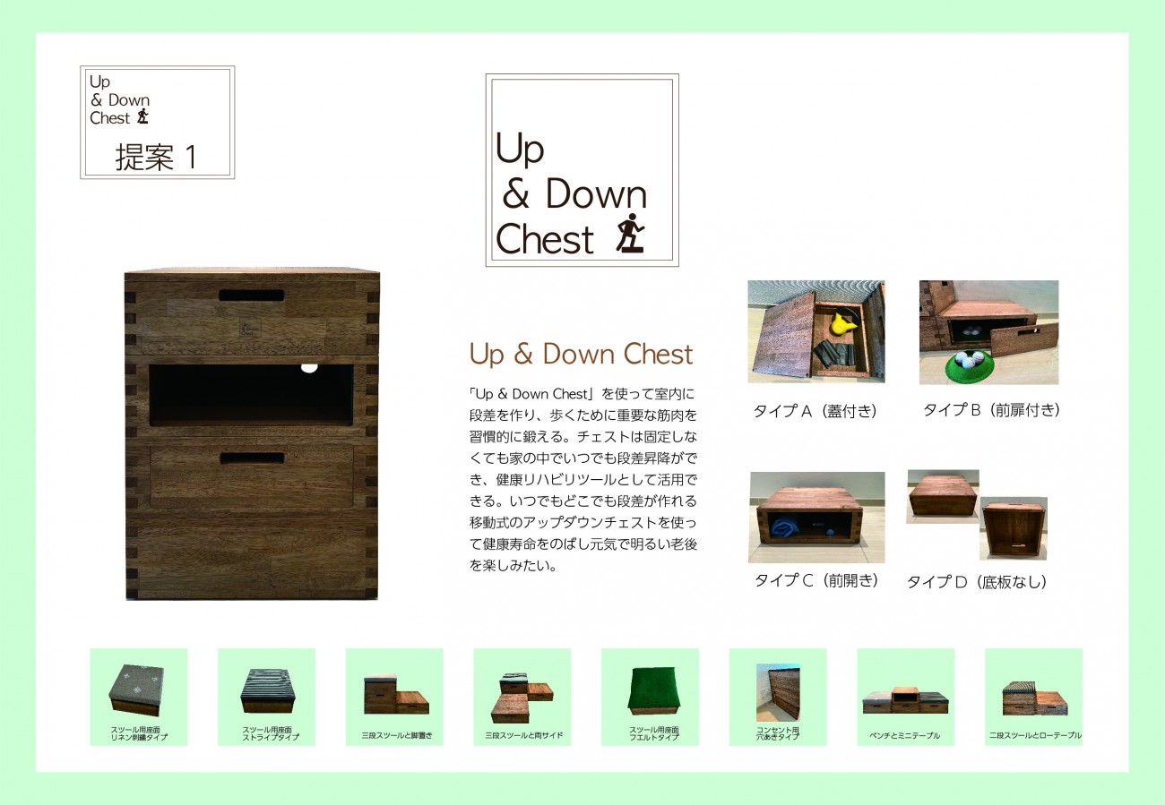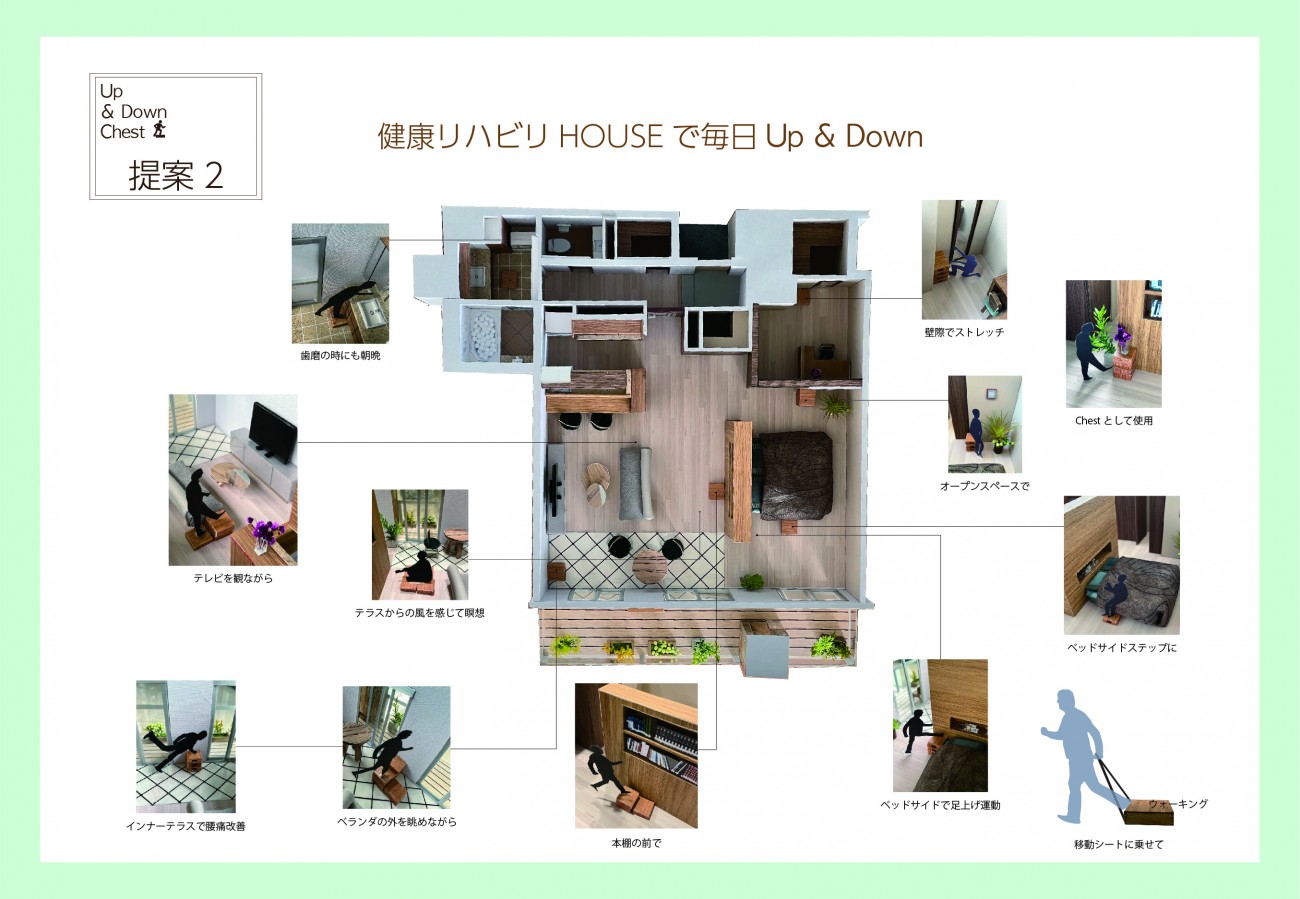 コンセプト:健康長寿を目指し、寝たきりや要介護予防のためのツールを使って、段差昇降運動を毎日の生活の中に取り入れる。そのツールである「Up&Down Chest」は、固定しなくても家の中でいつでも段差昇降ができ、使わないときにはスタッキングして部屋の隅に置き、収納家具やスツールとしても利用できる。チェストを使って筋トレするための「健康リハビリHOUSE」は、間仕切りを極力減らし、回遊しながらトレーニングができる空間になっている。自分の足で生涯歩けるよう、楽しみながらアクティブなシニアライフを目指す。