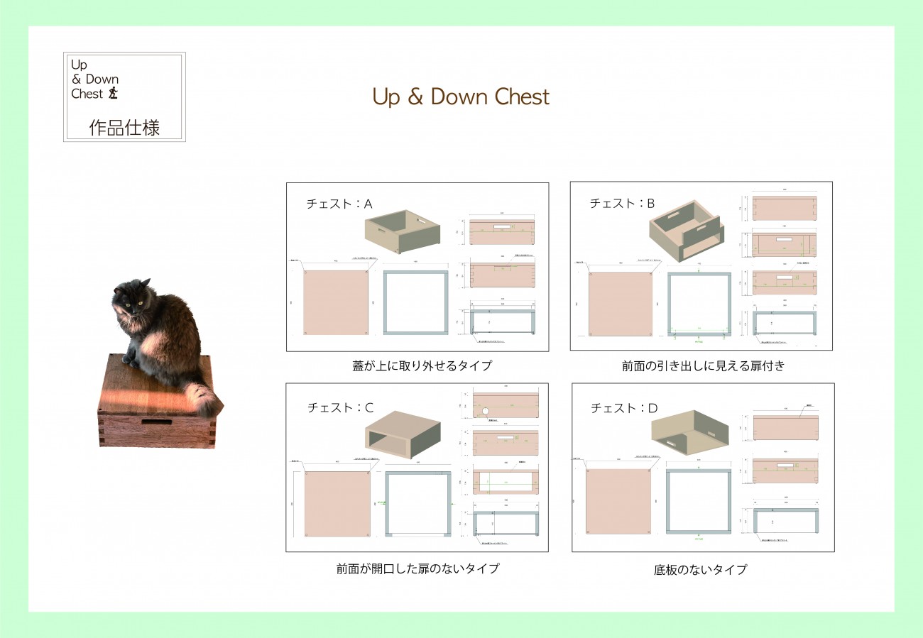 Up & Down Chestは4種類のユニットで組み合わせができる。素材:ロイヤルオーク集成材 Size:W400×D400×H150 A:上蓋付き B:前面扉付き C:前面開口 D:底板なし