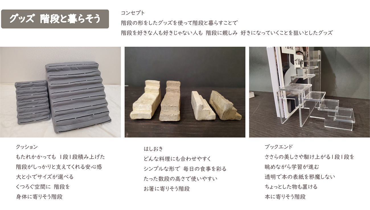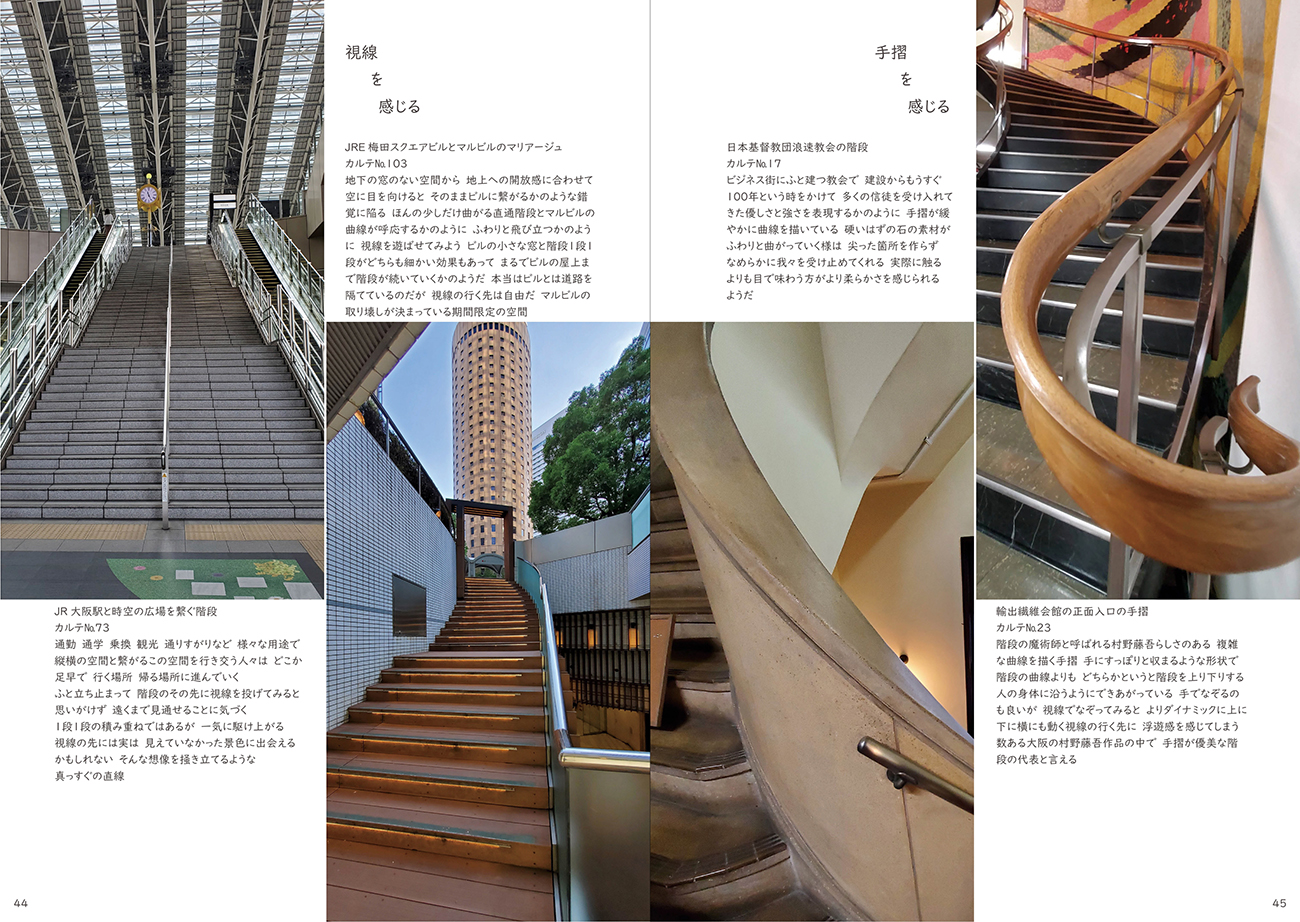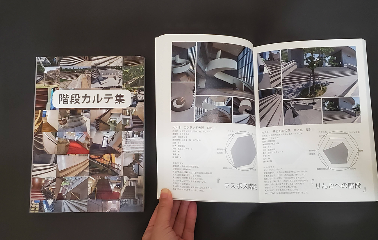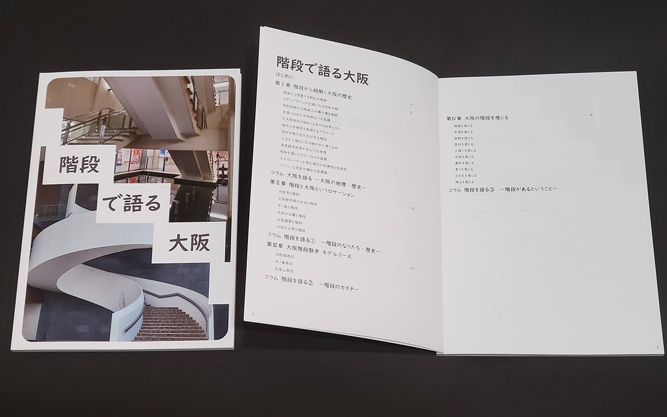 階段は好きですか。あなたの身近な階段はどんなものですか。階段は、面倒・つらいなど何かと嫌われがちな存在です。けれど、私たちの暮らしには欠かせない、大切な存在であり、上り下りのための道具だけではなく、様々な魅力があります。誰にとっても身近な建築造形である階段が持っているダイナミックさ、楽しさ、面白さを研究し、広めることができれば、より階段を好きな人が増えるはず。そして階段を好きになれば、何気ない毎日はきっともっと楽しくなっていくはず。そう考え、私が暮らすまちである「大阪」の階段を集めて歩いてみると、これまで知らなかった大阪の姿がたくさん見つかりました。 それら気づいた大阪の階段の魅力を本としてまとめ、さらに階段を楽しめるグッズを制作しました。 階段好きの、階段好きによる、階段好きもそうじゃない人も楽しめる日常にお誘いします。 階段を通して見た大阪を知って、より大阪を、そしてより階段を好きになってください。