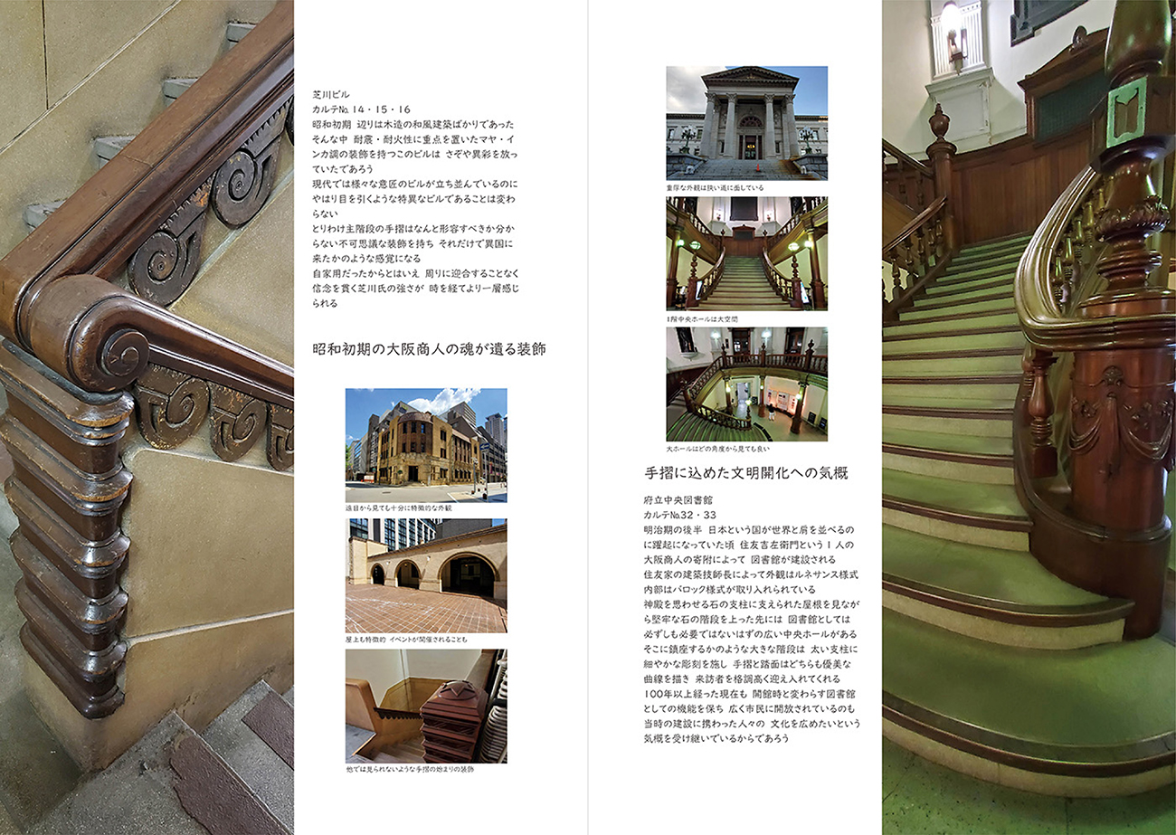 よみもの《階段で語る大阪》 (カラー・58ページ)自分が住む街である「大阪」を、「階段」という切り口で語り、紹介することによって、有名なはずの大阪の新たな面に気づいてもらう一冊。この本を読むことで、階段への理解を深め、興味を引き、読者の住む地域の階段へと想像を広げてもらうことを目的として制作しました。4章構成となっています。 実際に読んでもらった感想として、「これまで何も感じなかった階段を、もっとじっくり楽しみたくなった。」「大阪と階段を大事にしているのが分かる冊子だと思った。」「写真の切り取り方で、知っている階段ももう一度見たくなった。」などをいただきました。