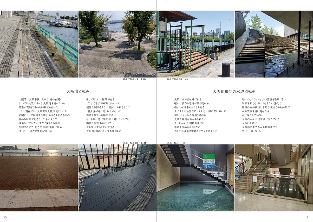 よみもの《階段カルテ集》(カラー・192ページ)は、収集した大阪市の階段を190掲載する冊子です。次々と読み進めていくうちに、いつの間にか好きな階段はどれか探していたり、それぞれの違いを見つけようとするなど、階段そのものの持つ性質や周辺との関わりなど、佐々間な面に気づいてもらい、楽しんでもらいたいと思い制作しました。