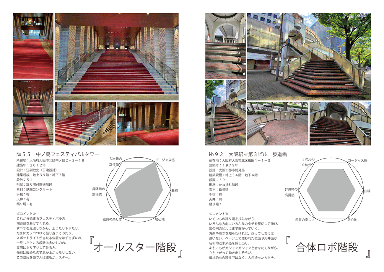 1階段1ページで、写真を大きく配置し、住所や設計者などの基本情報から、独自につけたニックネームや実際に上り下りした感想、階段の形状や印象を6指標にまとめて表現したものを掲載。