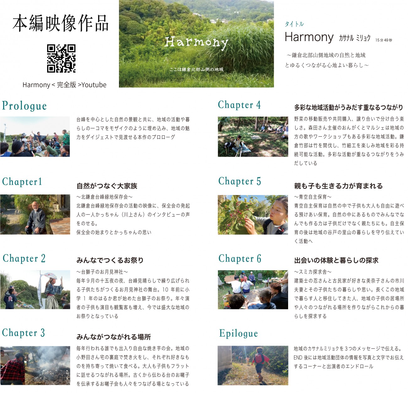 この地の多彩な地域活動の魅力を私自身が直に感じたそのままお伝えするため、実際に地域活動に参加して地域の人々の活動するそのままの姿、そのままの声、そのままの言葉を撮影収録し、地域の人々や私自身の思いを編集して映画にしました。