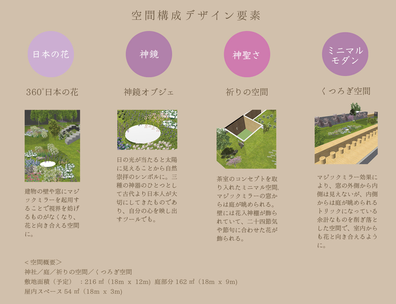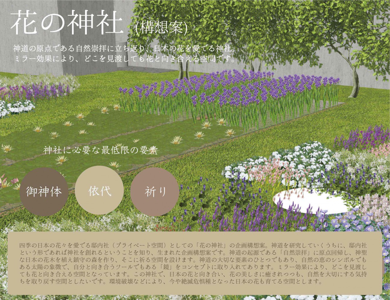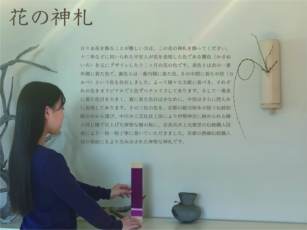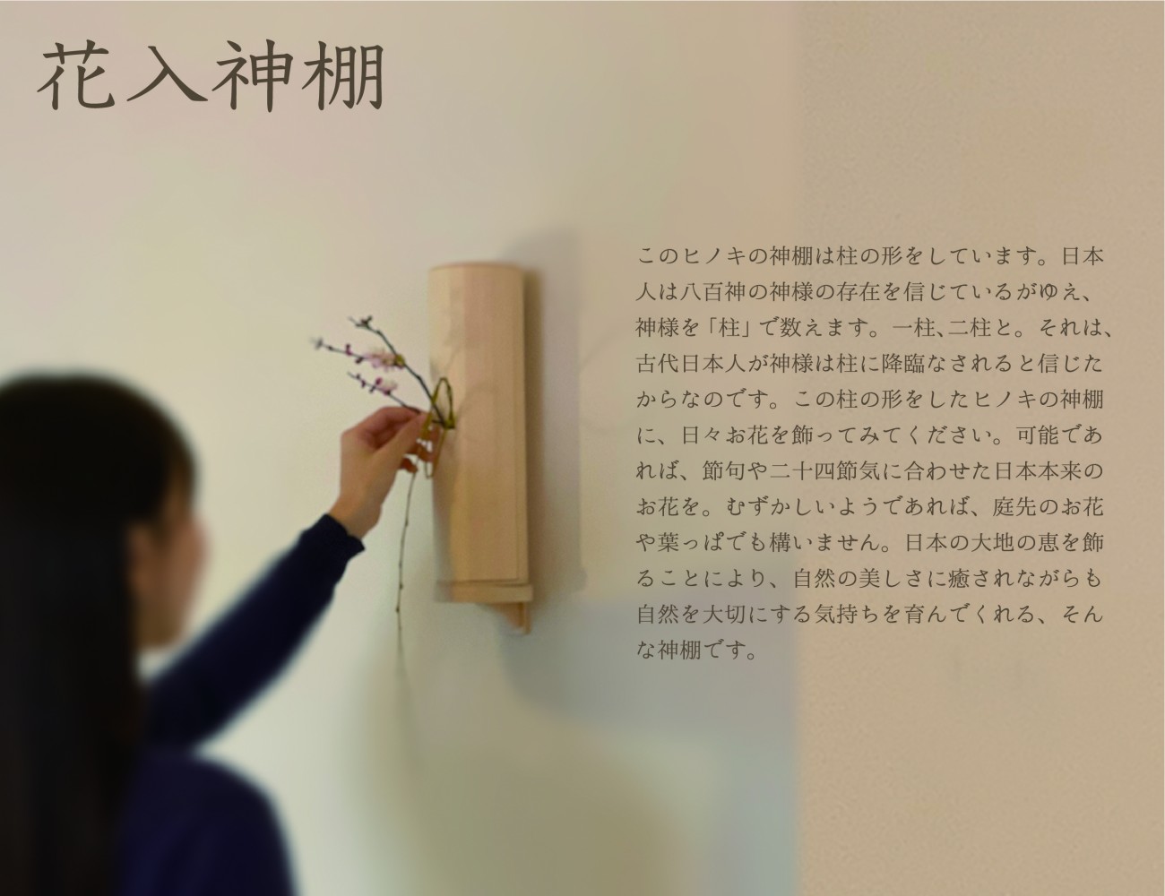 現代人のライフスタイルに寄り添う新しい形でありつつ、本来の神道の姿でもある、「花の神様」(花入神棚・花の神札・花の神社)を提案し、花の力に癒されながら、自然を大切にする心を養い、自然と上手に共生するライフスタイルを身につけてもらえればと思います。