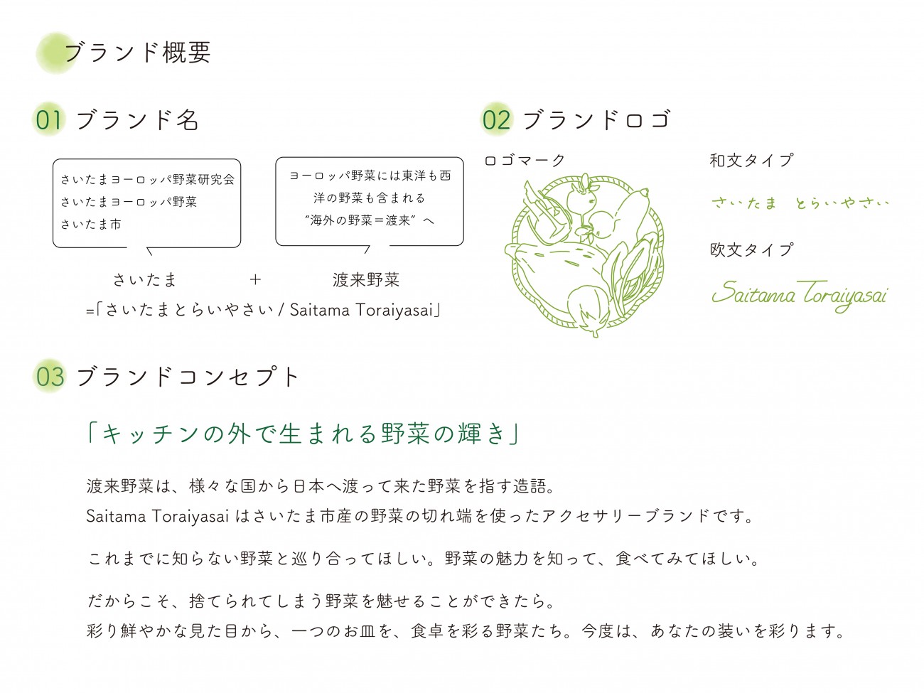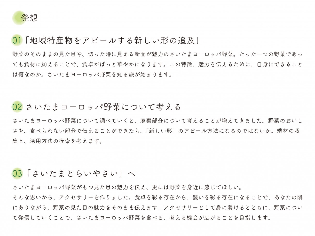 課題に取り組むことによって、さいたまはなにもない “ださいたま” ではなく、多彩な魅力のある” たさいたま” であることを発信したい。野菜を身近に感じる表現をすることで食について考える機会を創出し、郷土愛の育成を促す。また、地元で作られる野菜を消費する “地産地消” を促すことでフード・マイレージの減少を促し、持続可能な社会の実現に貢献する。