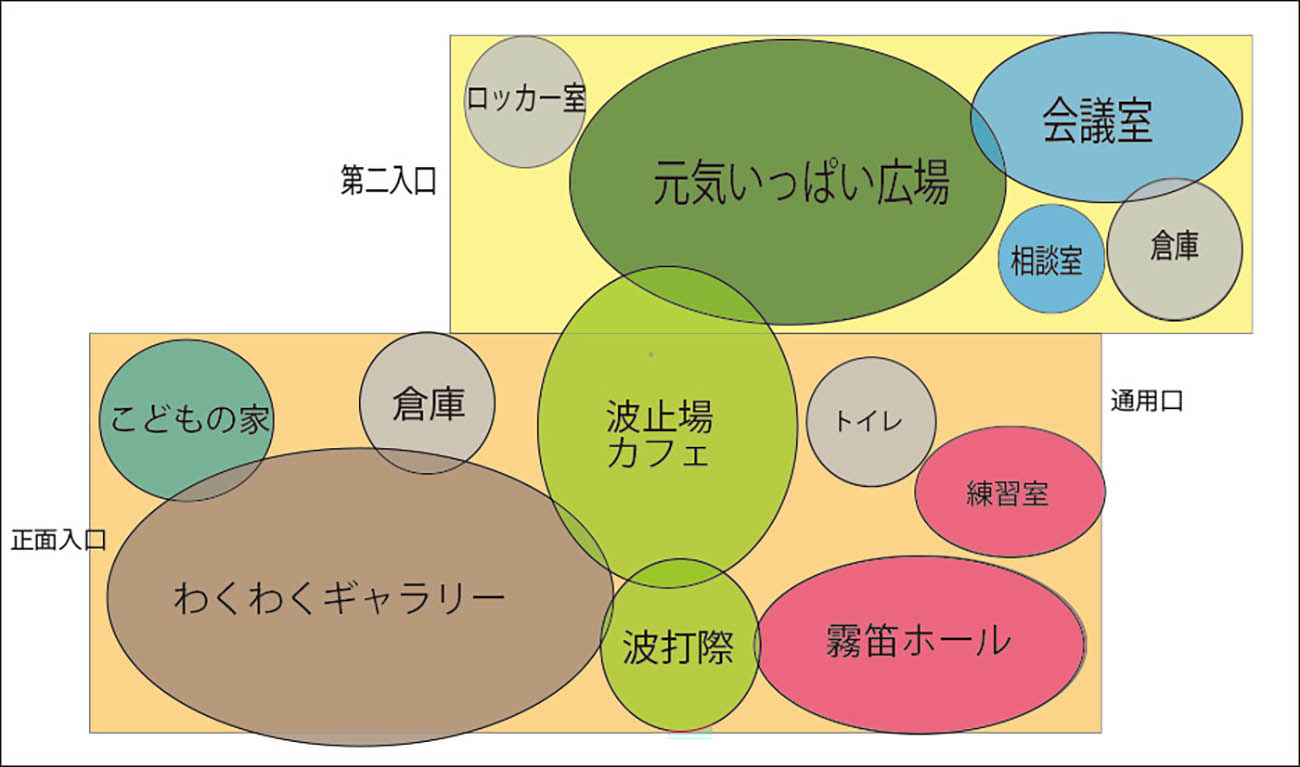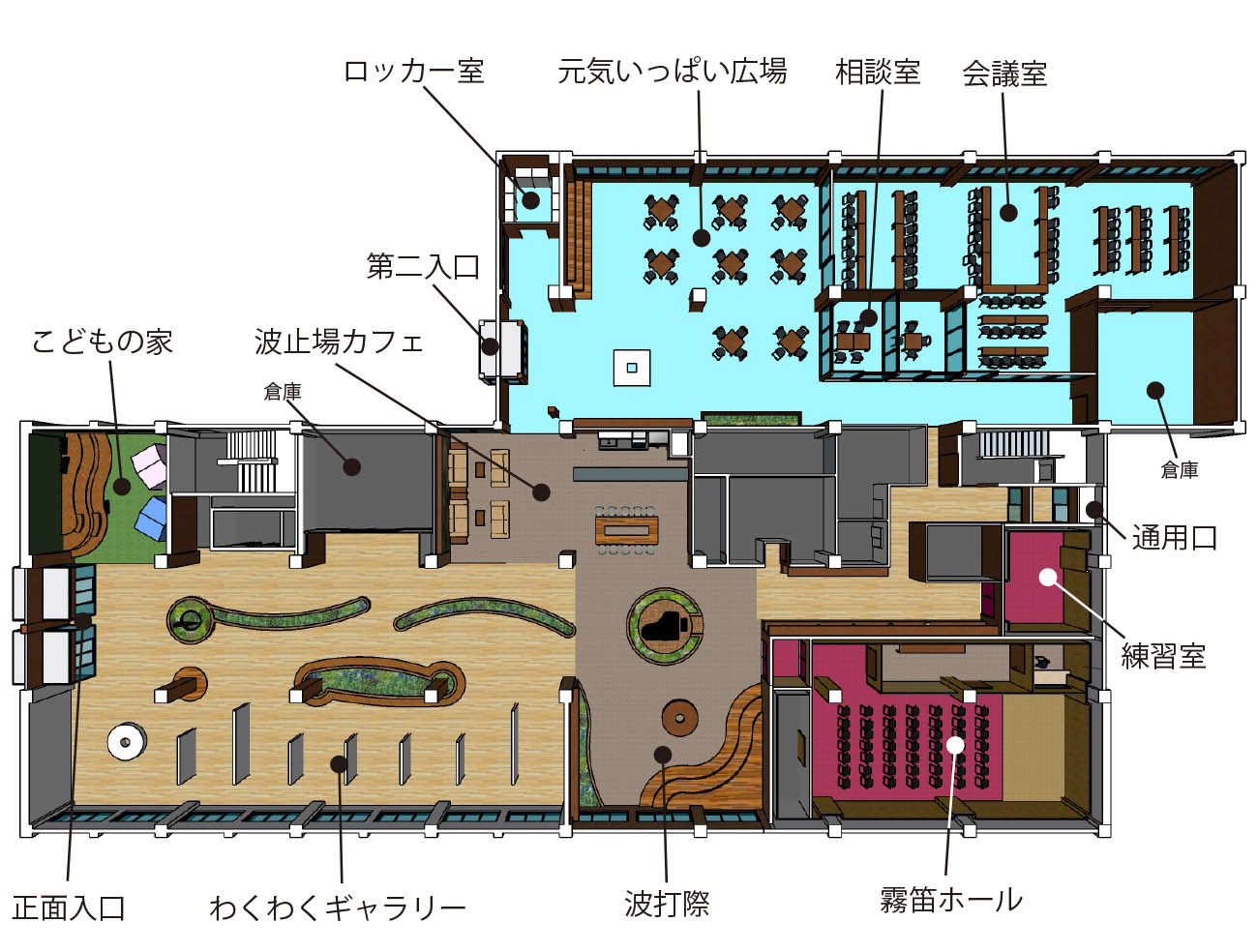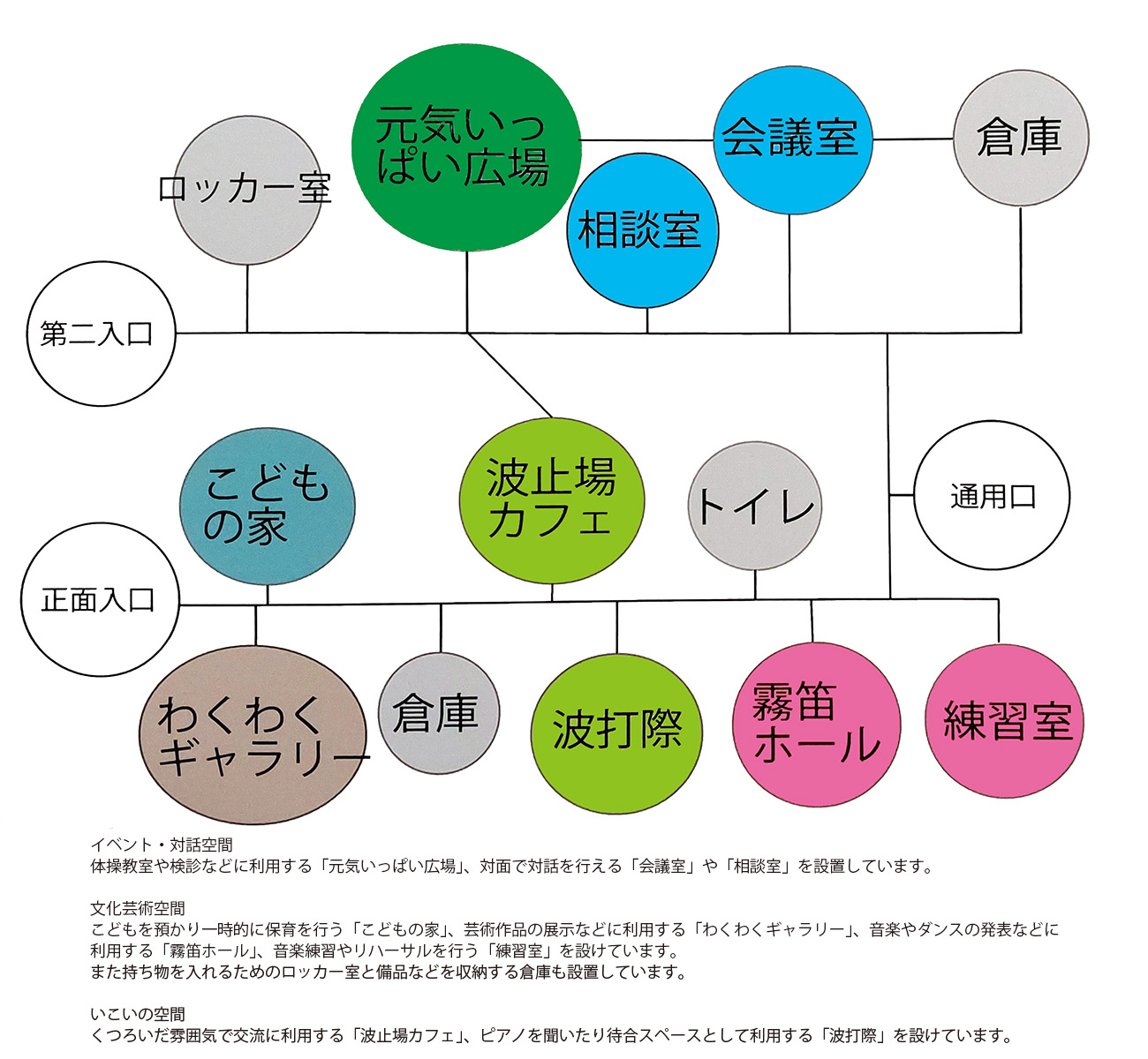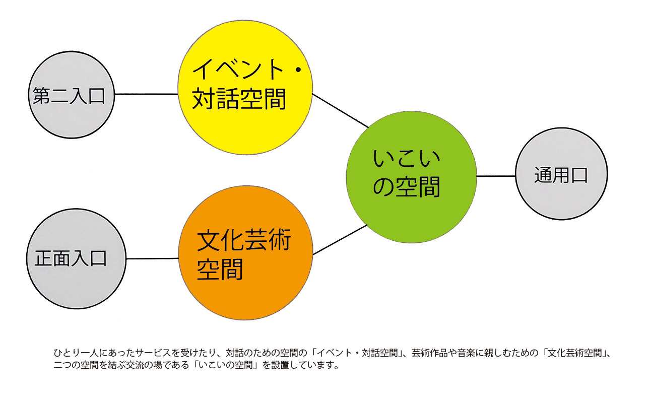 行政の手続きはすべてデジタル化されます。そして、行政の提供するサービスは、ひとり一人の生活や人生を豊かにすることへと重点が移っていきます。この変化に対応するため、区役所の1階は、これまでの窓口や待ち合いに必要な空間から、区民の生活を豊かにする活動が行われる全く新しい空間へと生まれ変わります。そこでは、音楽や芸術作品に親しみ、人と人のつながりが育まれるとともに、様々な研修や検診などの行政サービスや地域の課題について話し合が行われていくことになります。