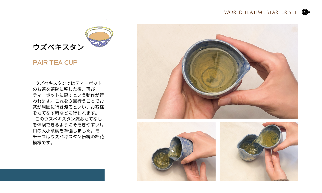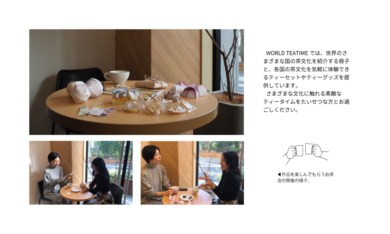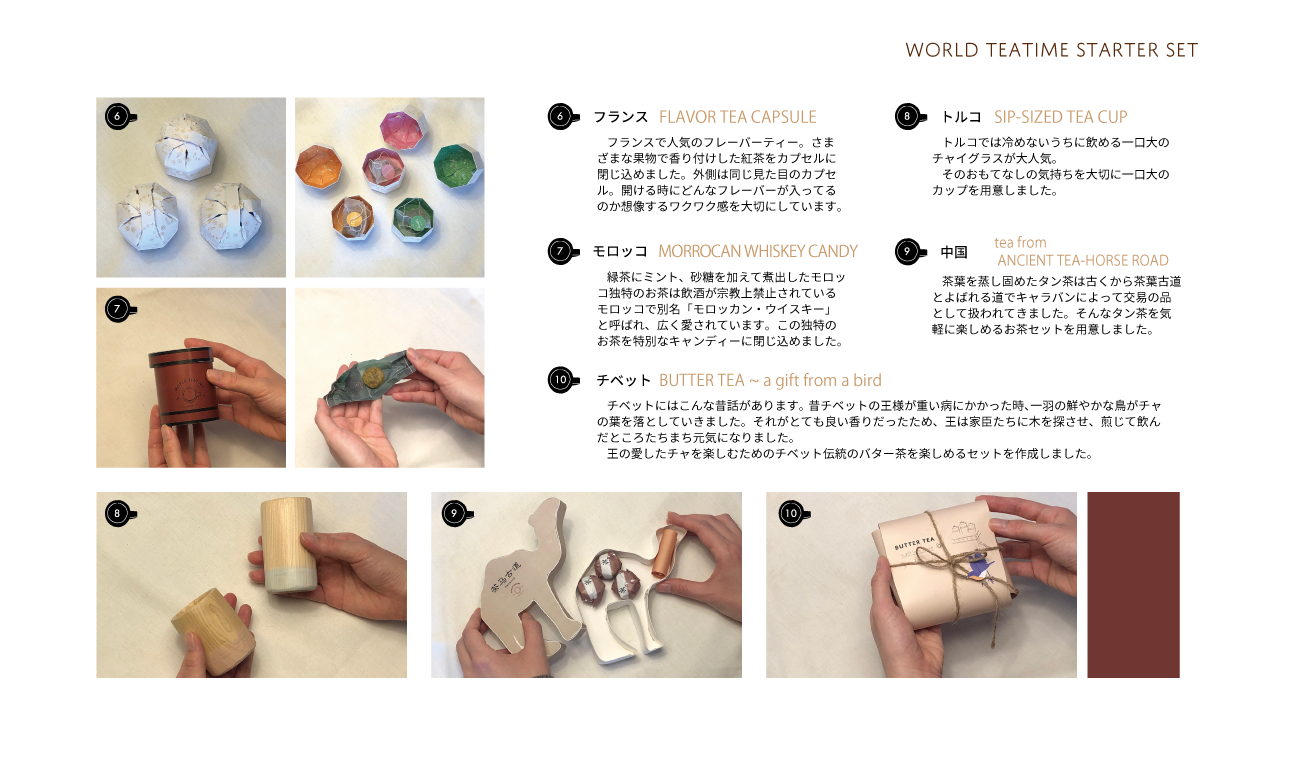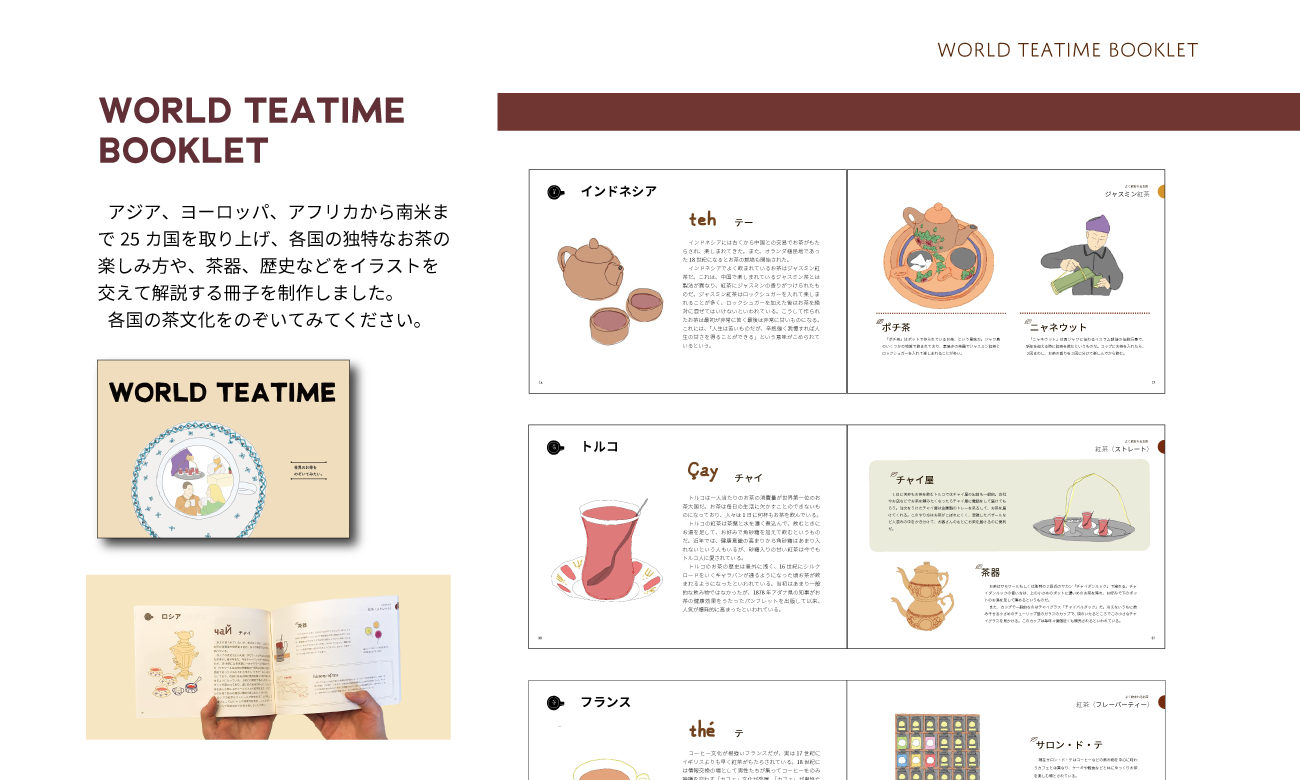 世界の茶文化をテーマに、コミュニケーションツールとしてのお茶の新しい楽しみ方を提案するため、各国の茶文化を紹介する冊子とさまざまな茶文化を気軽に楽しめる茶器やパッケージを作成しました。