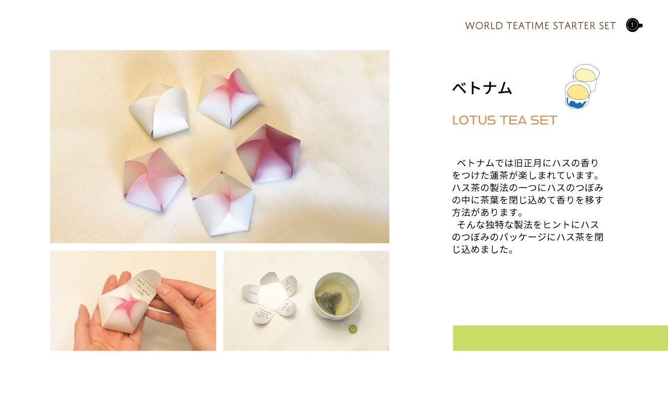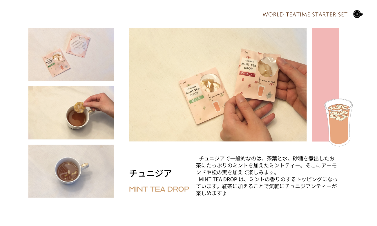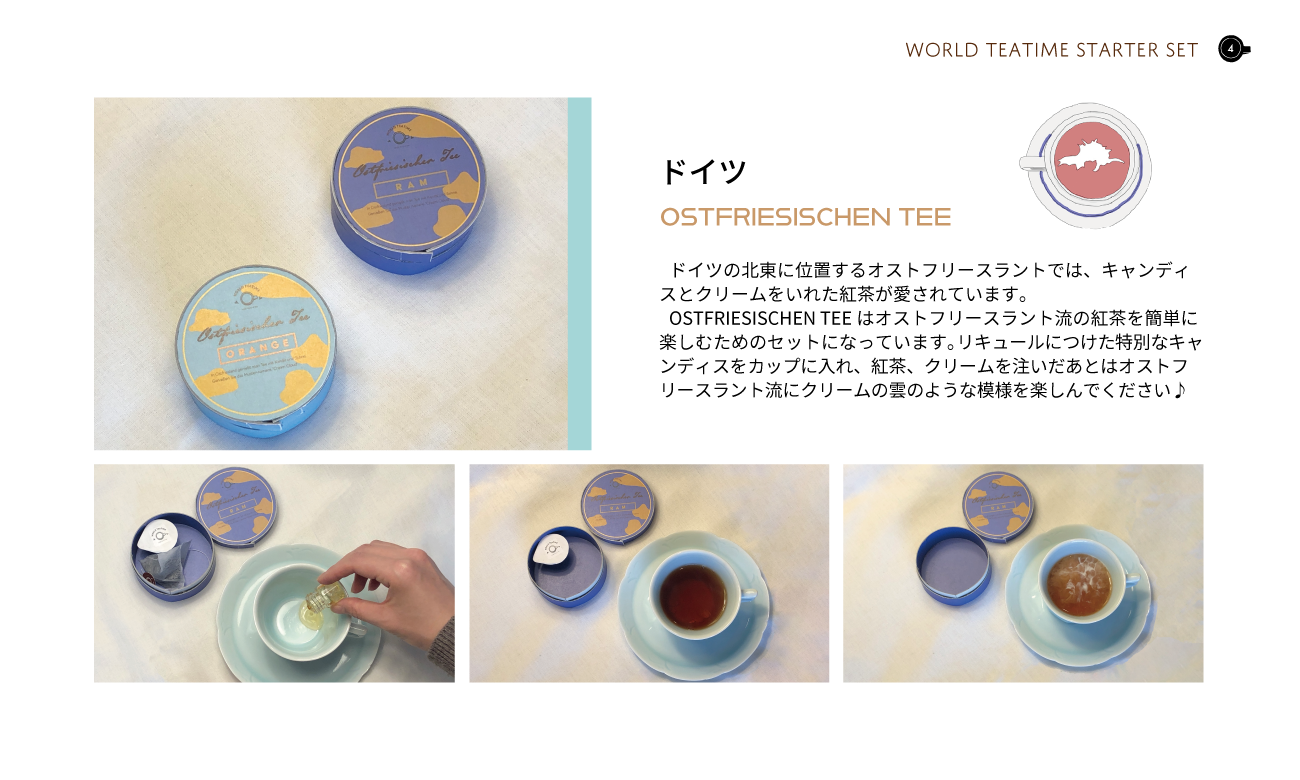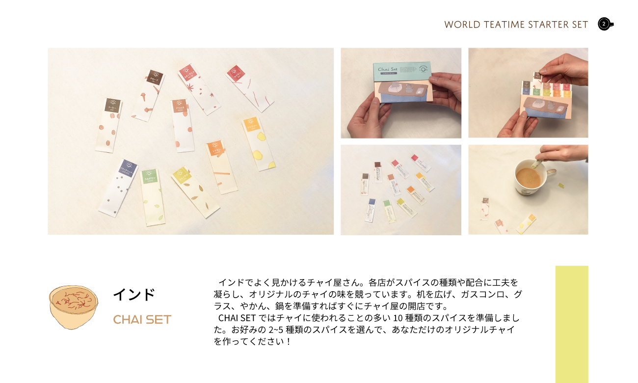 世界の茶文化をテーマに、コミュニケーションツールとしてのお茶の新しい楽しみ方を提案するため、各国の茶文化を紹介する冊子とさまざまな茶文化を気軽に楽しめる茶器やパッケージを作成しました。