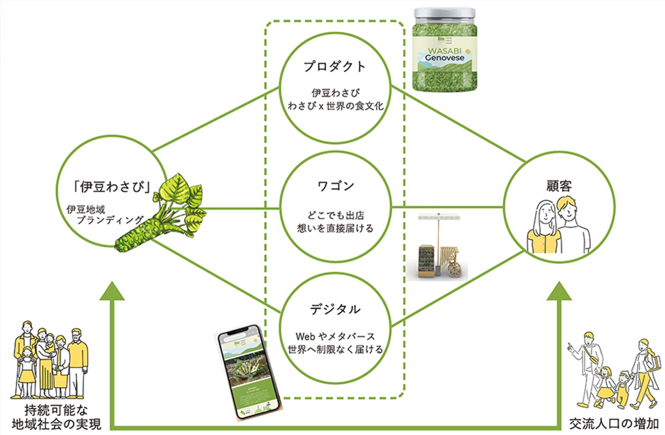 「わさびのある食卓」を実現するためには、顧客との多くの接点が必要であるため、プロダクトや直販できるワゴン制作を行います。また、世界中に届けるためにインバウンドやメタバース等の幅広い発信チャンネルを想定しています。