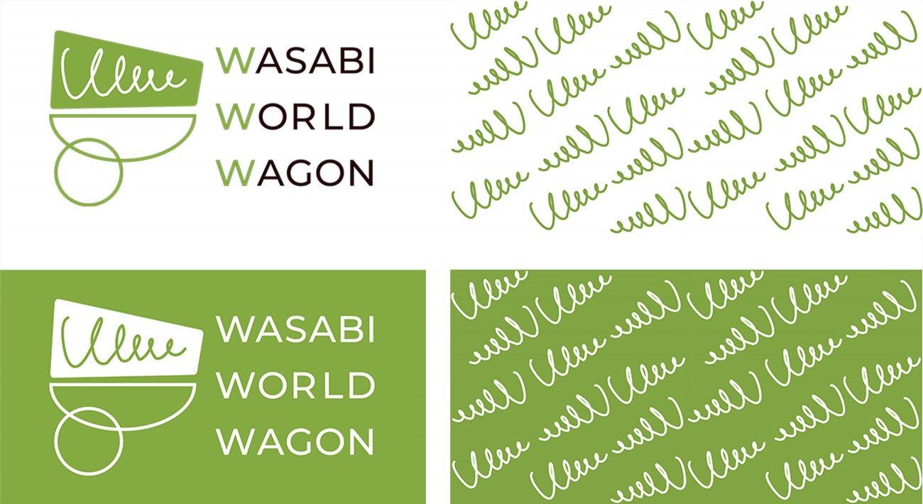 デザイン方針は「温かみと抜け感のある洗練されたデザイン」としています。誰もが手に取りやすいデザインによって「わさびのある食卓」を実現するために、わさび感を前面に押し出すのではなく、丸みや人の温かさがあるような洗練されたデザインが必要だと考えました。コンセプト体現だけでなく、"World Wasabi Wagon" の頭文字である"WWW" を用いてわさびを抽象化したパターンも作成し、食卓やワゴンの造形にも重ね合わせ、手書きスケッチでデザインをまとめました。色は本物のわさびの写真から抽出した緑色をキーカラーとしています。フォントは優しさや丸みもあり、わさびの持つどっしり感や安定感のある"Montserrat" を使っています。