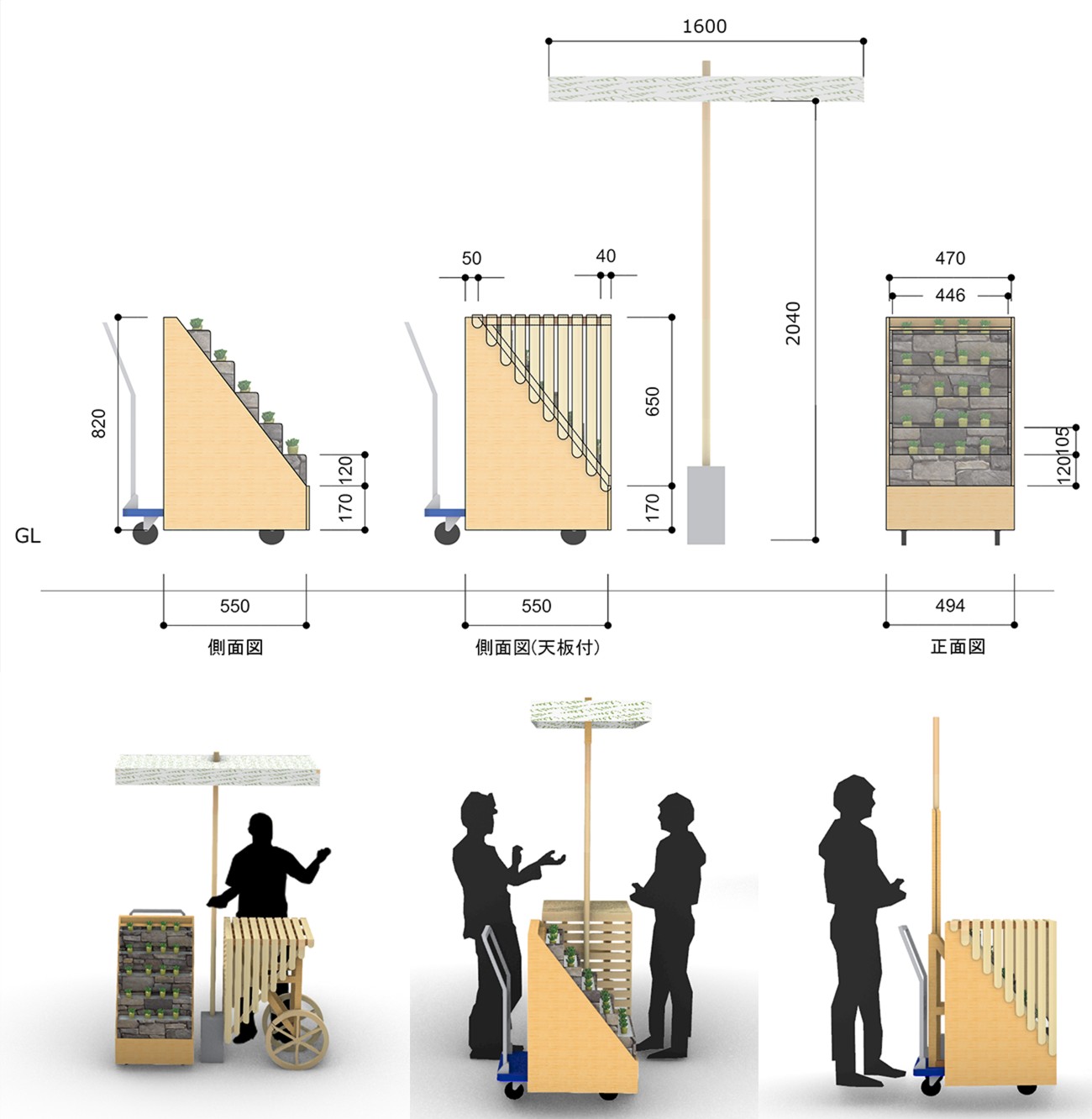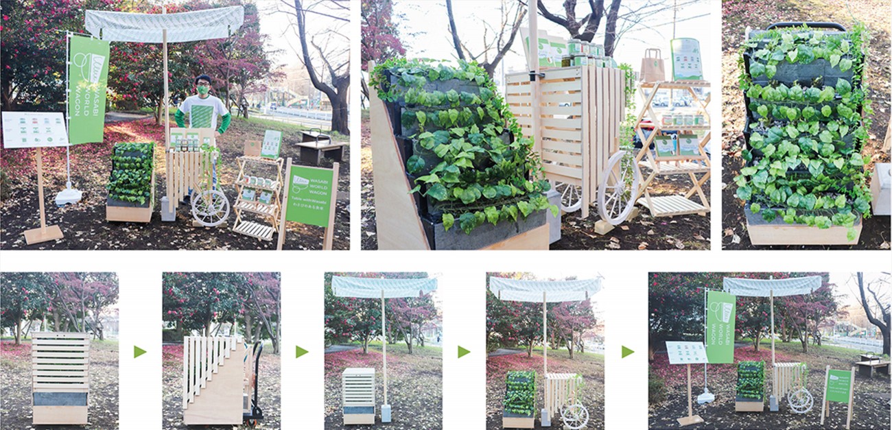 ブランドをマルシェ等で直接伝える目的のワゴン。コンパクトな状態から展開すると木の温かみのある空間に、五感に「伊豆わさび」のしずる感を伝えられる仕組みです。