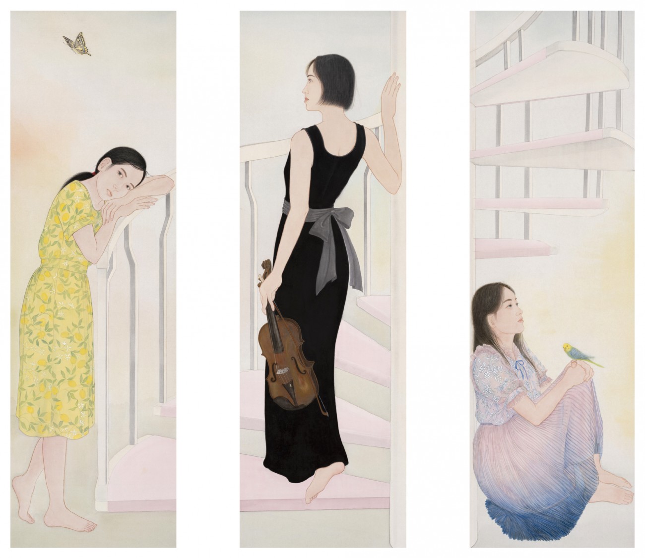 三幅が自立している上で、背景の螺旋階段は共通している。螺旋階段を上がることで少女の成長していく姿を表した。立ち上がり、踏み出し、上る、自分の力で耀くこと。そんなおもいを込めて描き上げた。