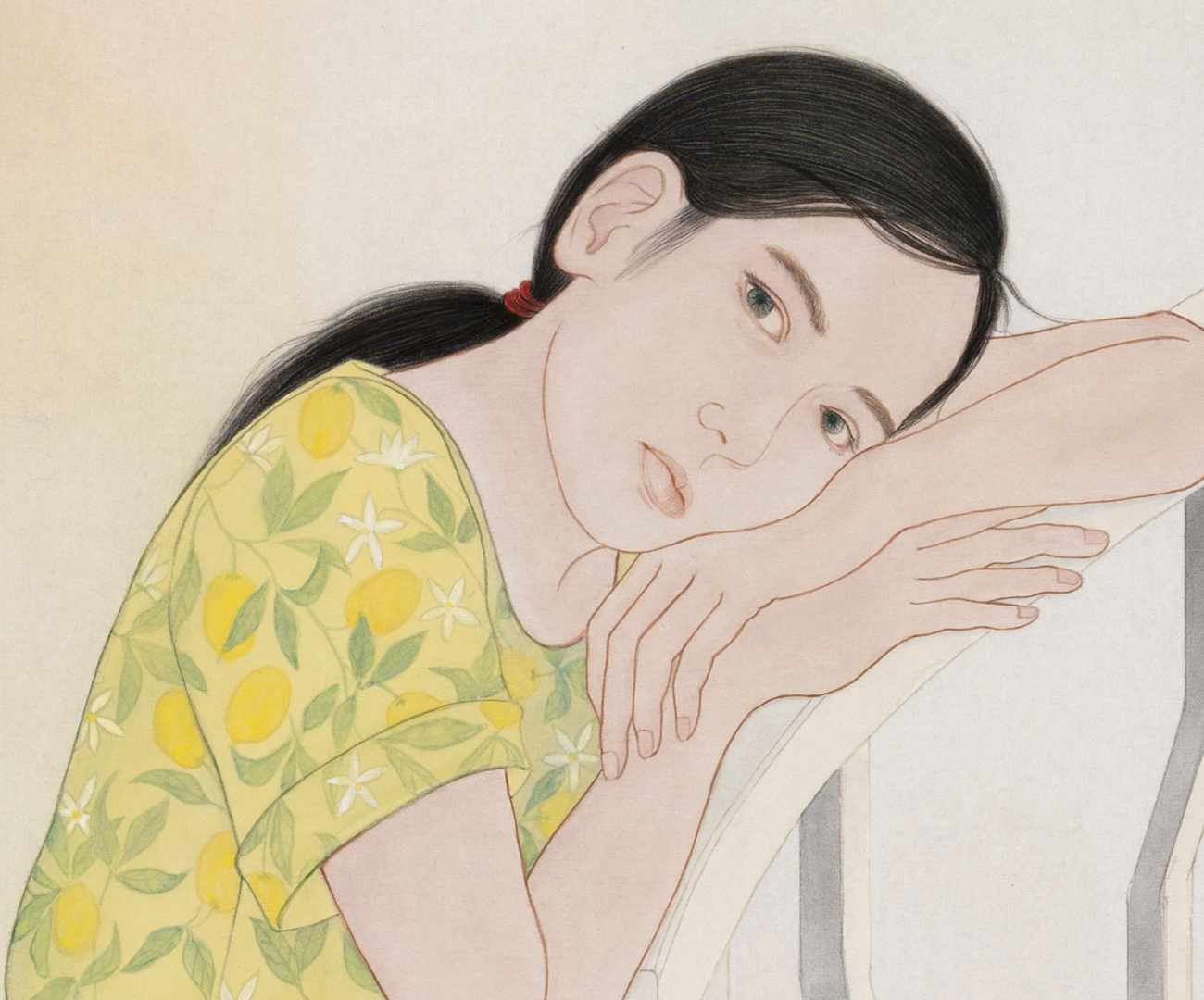 絵絹に描き、少女三人を三幅対に仕立てた。