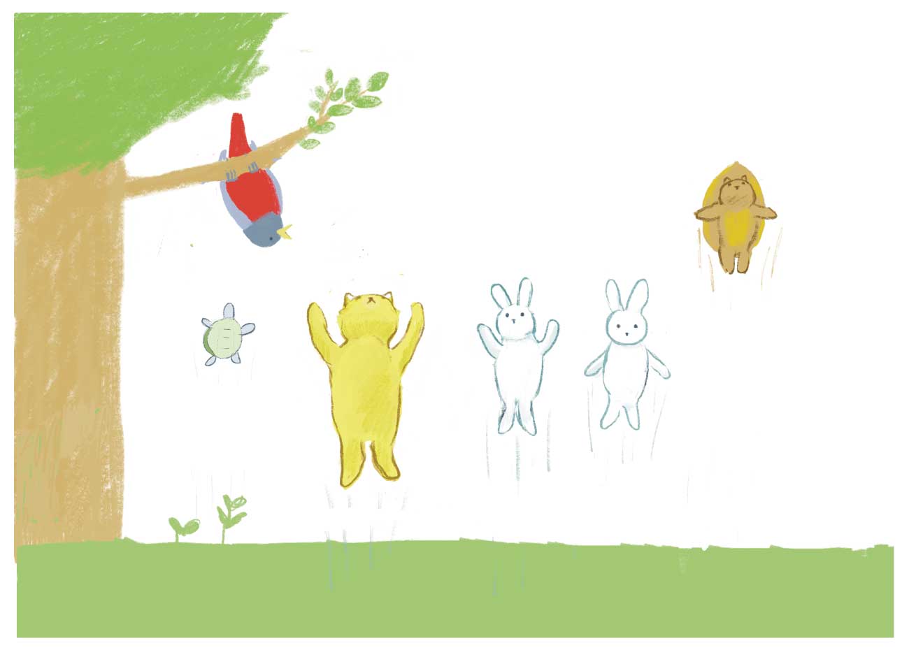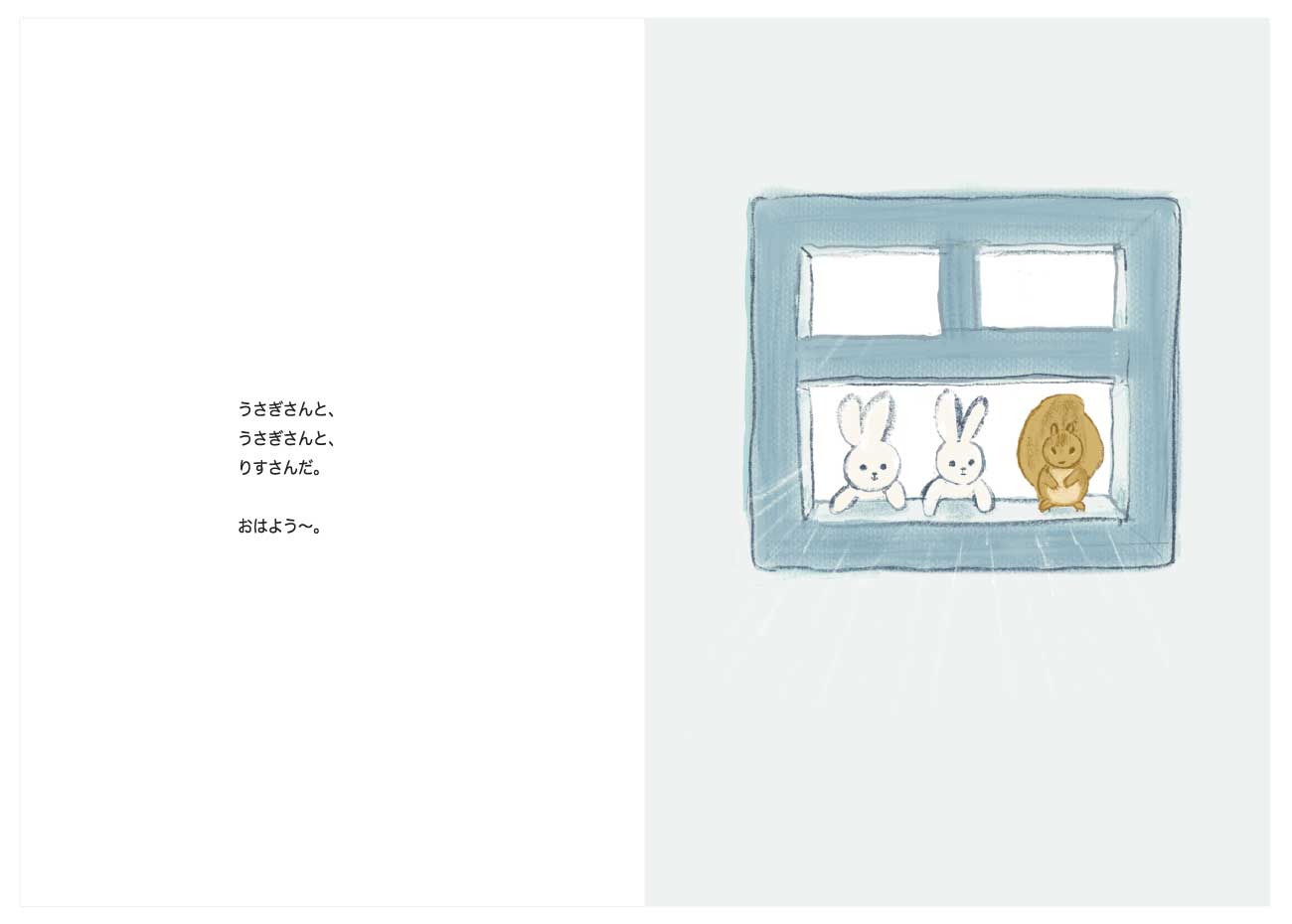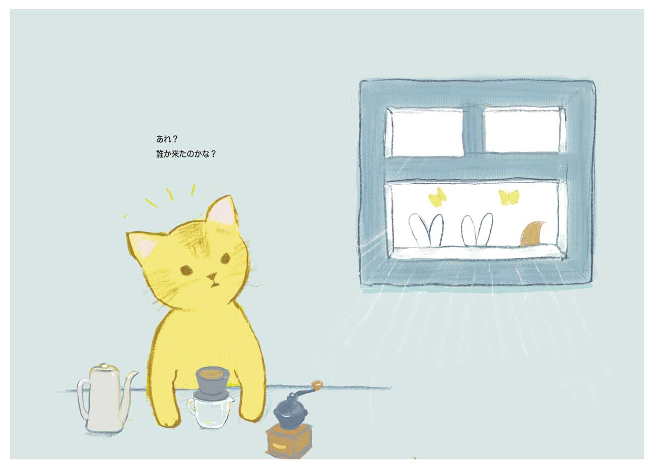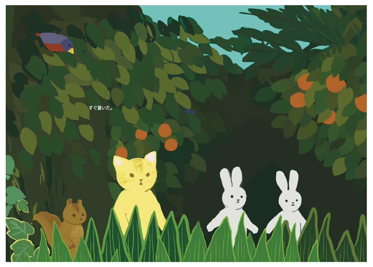 はじめに現れたのは「うさぎ」と「うさぎ」と「りす」でした。主人公のネコは「うさぎ」たちと一緒に「楽園」へ出かけて行き、楽しく過ごして、家に帰ってきます。ネコにとっての特別な一日ではなく、日常を描きました。詩のようで、少しナンセンスで、ほっとする絵本になったと思います。