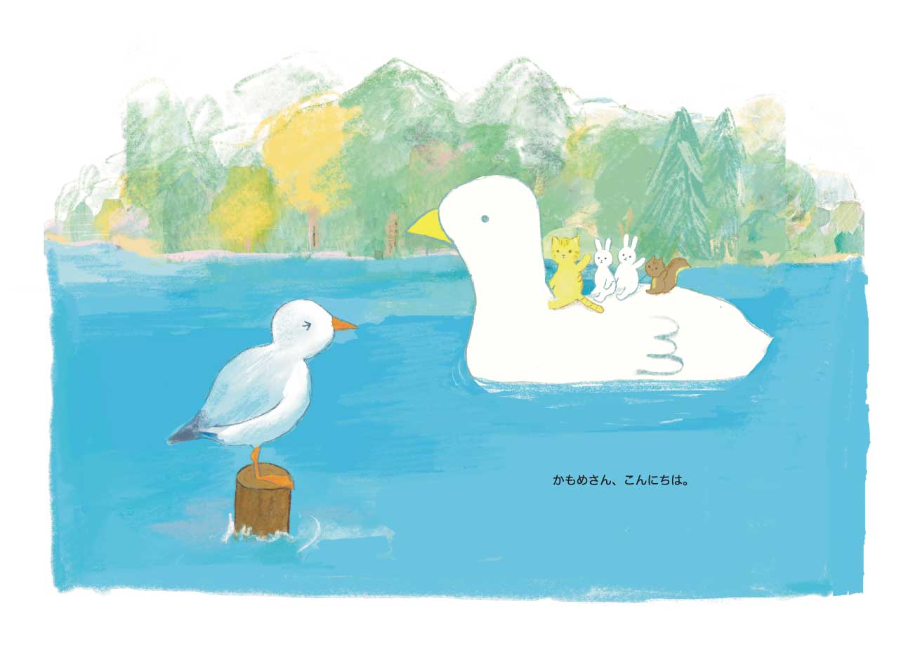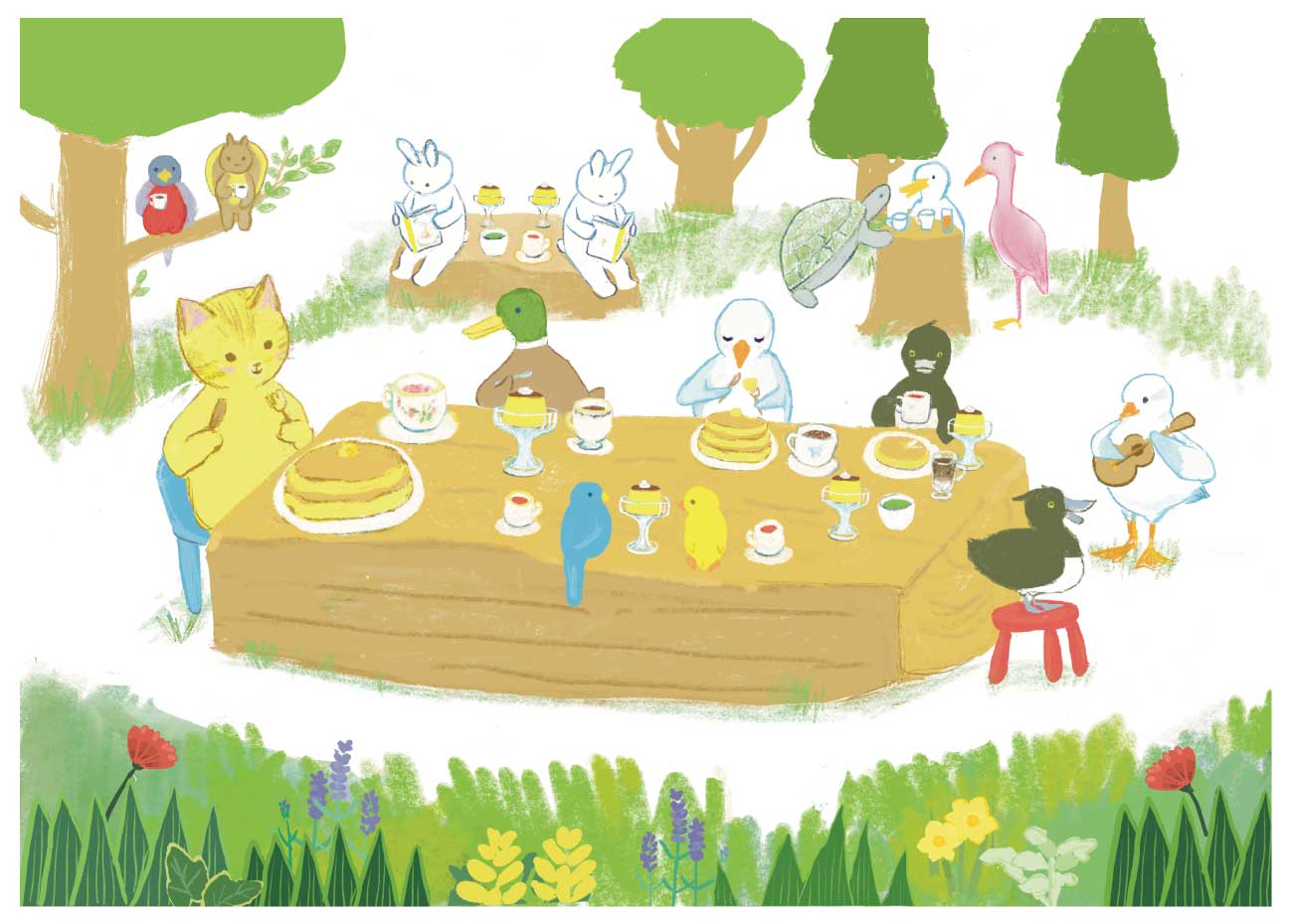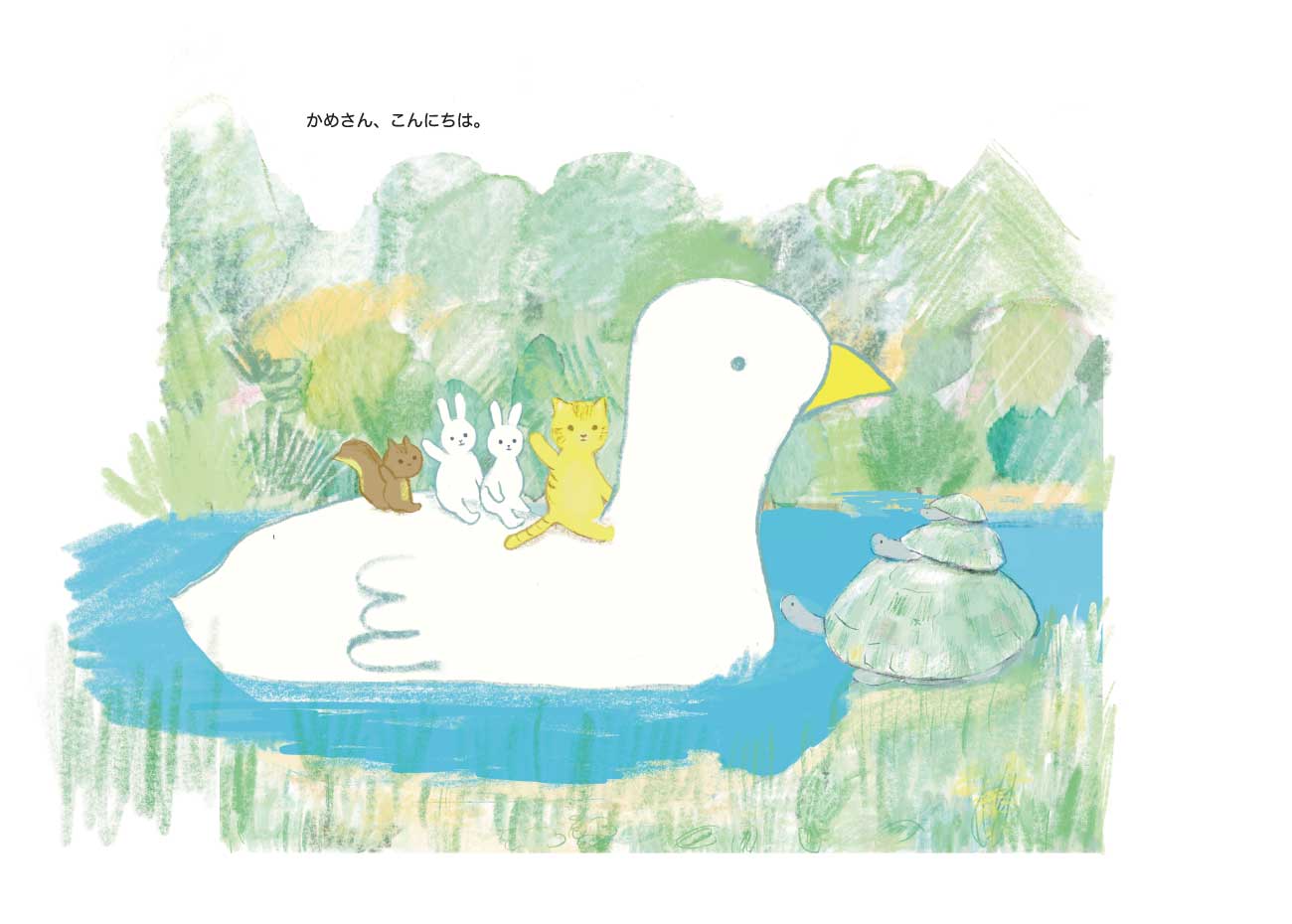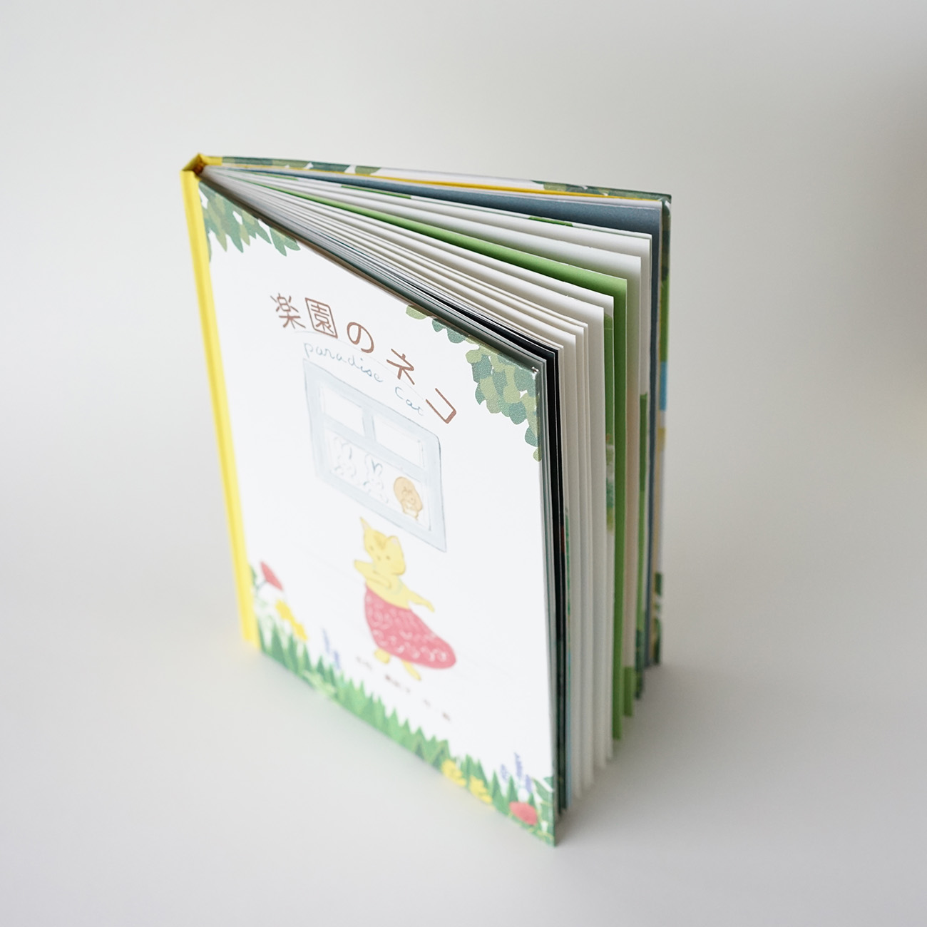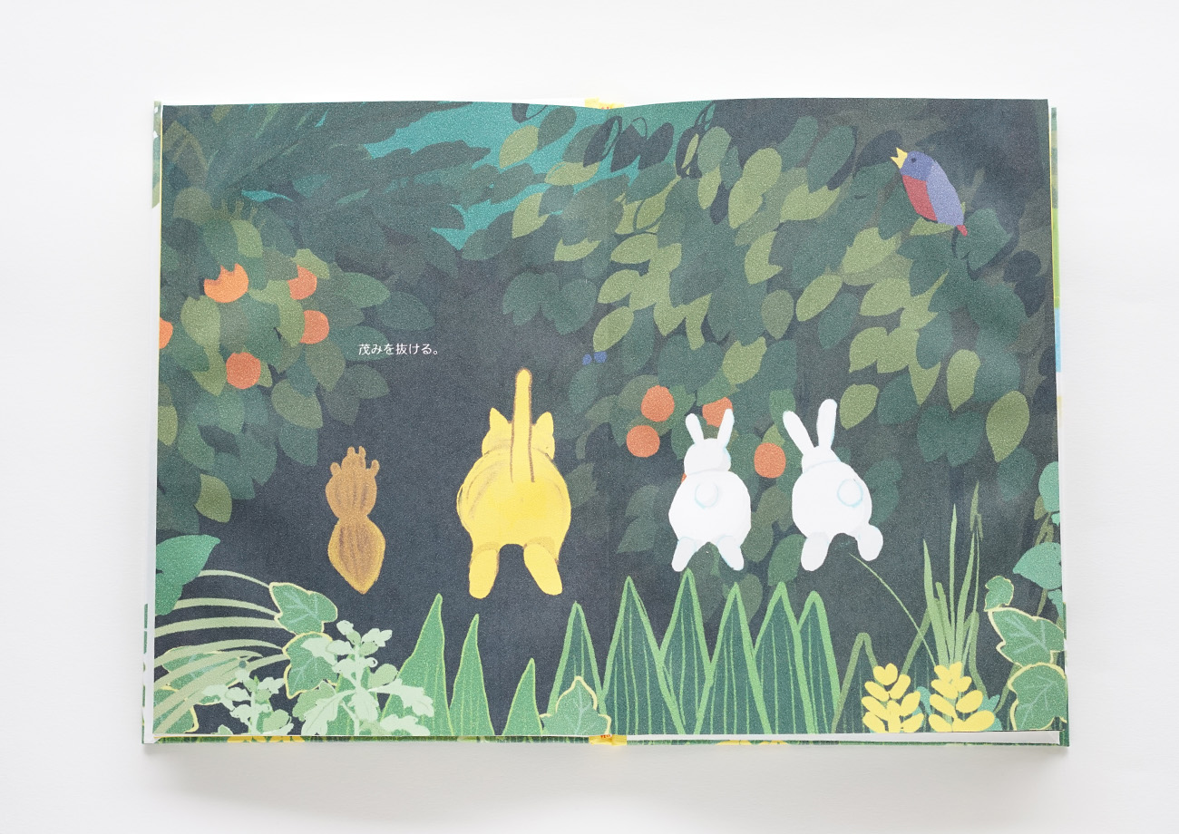 はじめに現れたのは「うさぎ」と「うさぎ」と「りす」でした。主人公のネコは「うさぎ」たちと一緒に「楽園」へ出かけて行き、楽しく過ごして、家に帰ってきます。ネコにとっての特別な一日ではなく、日常を描きました。詩のようで、少しナンセンスで、ほっとする絵本になったと思います。