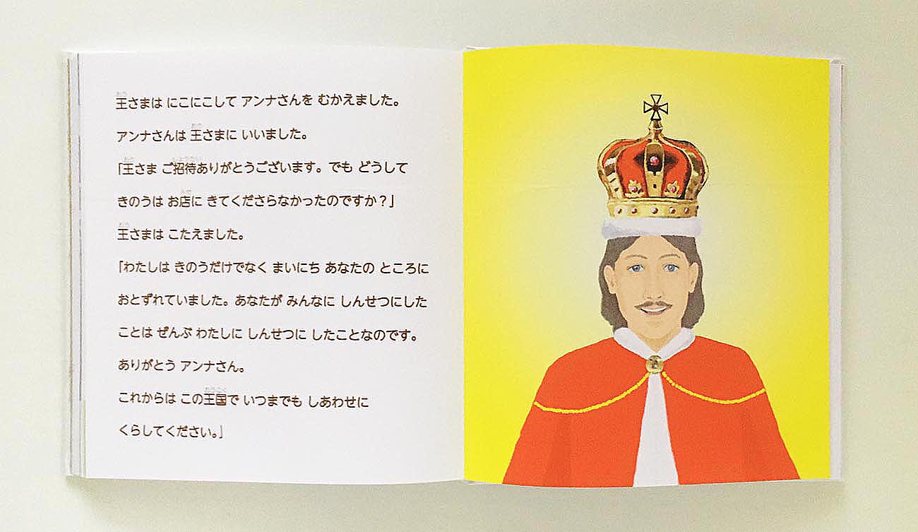 王様の前に出て、アンナは「どうして昨日はお店に来てくれなかったのですか」と訊ねました。王様は「私は、毎日あなたの店に行っていました。あなたが人に親切にしたことは、すべて私にしてくれたことです。ありがとう、アンナさん。これからはこの王国で幸せに暮らしてください。」と言いました。