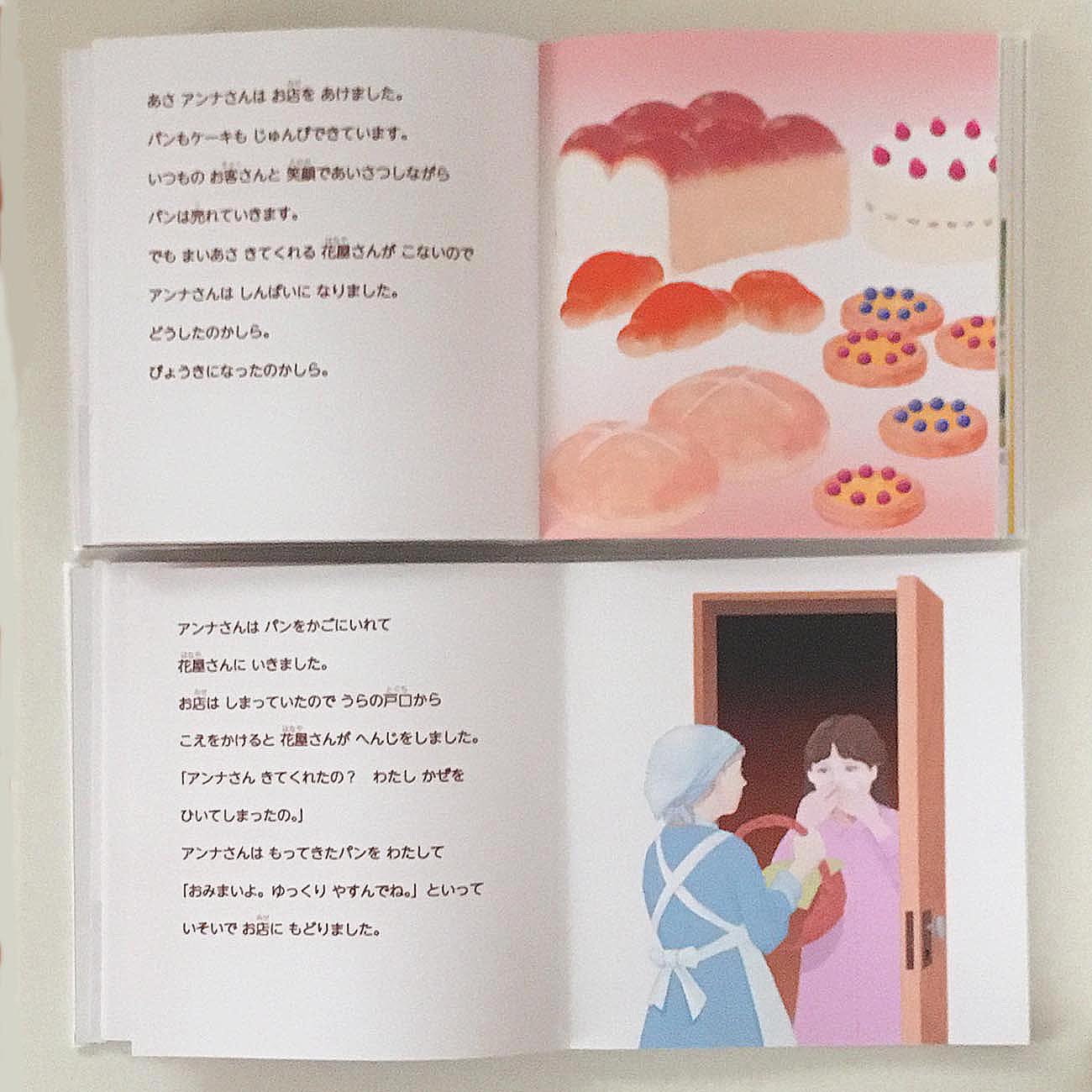 翌日、いつもパンを買いに来る向いの花屋さんが来ないのを心配したアンナさんが訪ねて行くと、花屋さんは風邪で寝込んでいたので、アンナさんはパンを差し入れました。