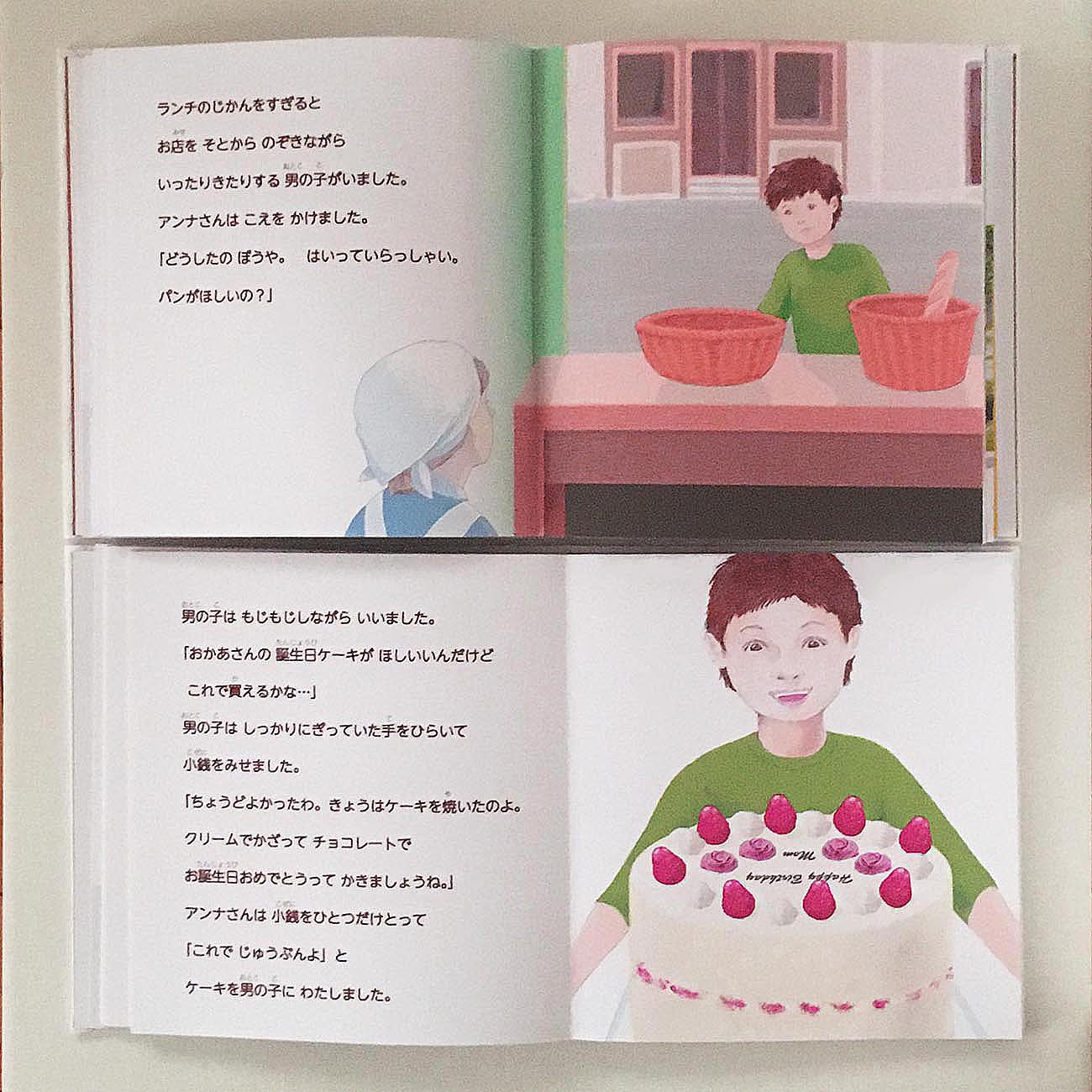 午後になると、店の前を行ったり来たりする少年がいました。アンナさんが声をかけると、貧しい少年は母親の誕生日だからケーキが欲しいと言いました。アンナさんはケーキにデコレーションを施し、少年に小銭1枚で譲りました。