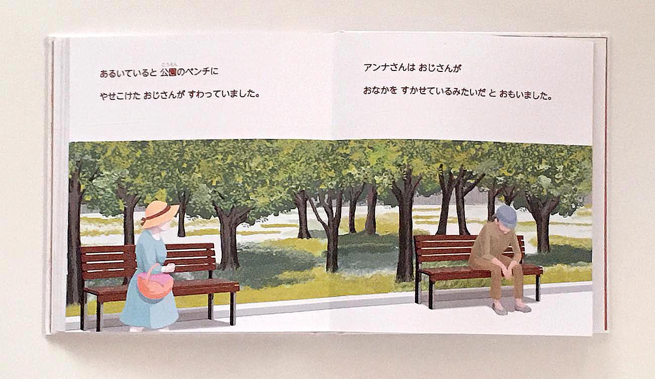 翌日、アンナさんは宮殿に向かいました。歩いて行くと、公園のベンチにホームレスの男性が座っていて、アンナさんはお土産のパンを籠ごと彼に渡しました。