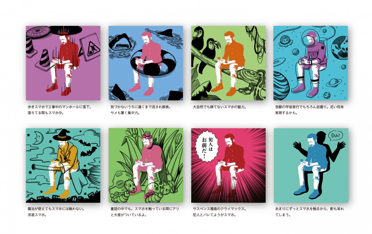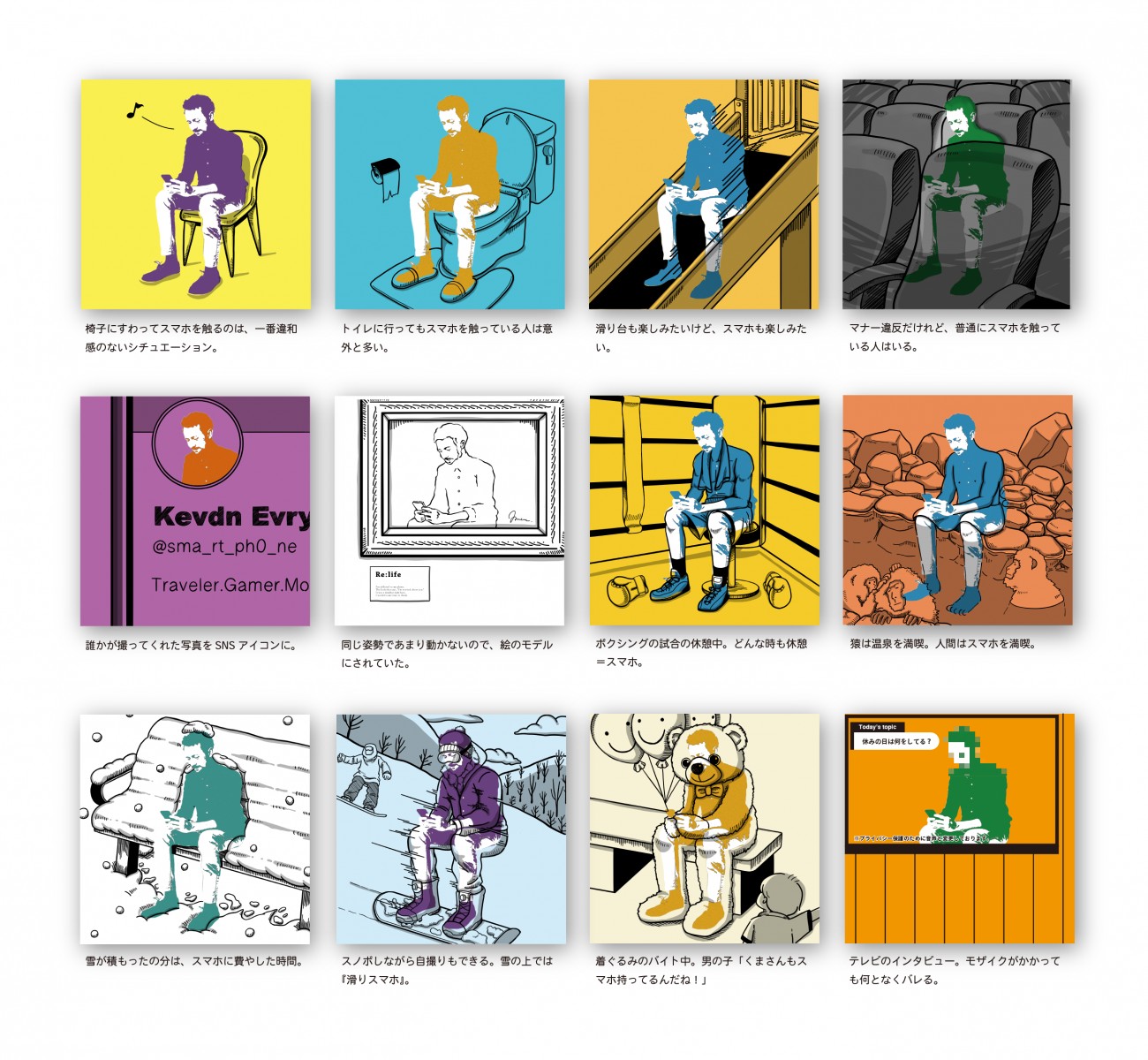 スマホを見ている毎日を『複製』と捉え、アンディ・ウォーホルのPOPアートに擬え、制作しました。スマホを見ている人物の画像をカラフルして並べ、そこにさまざまなシュチュエーションのイラストを描き足し、どこにいても何をしていてもスマホを見ているということを表現しています。