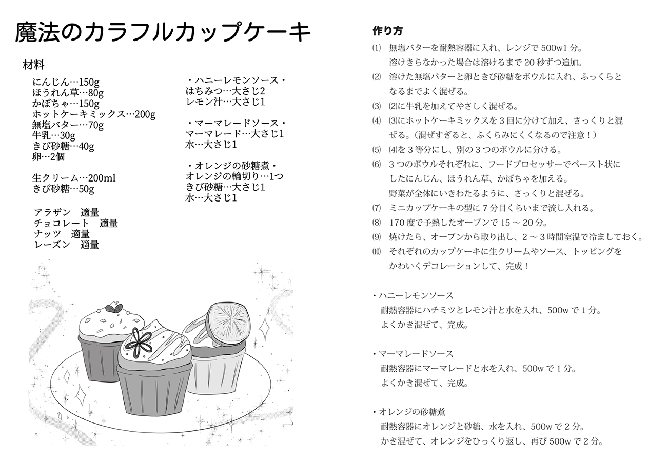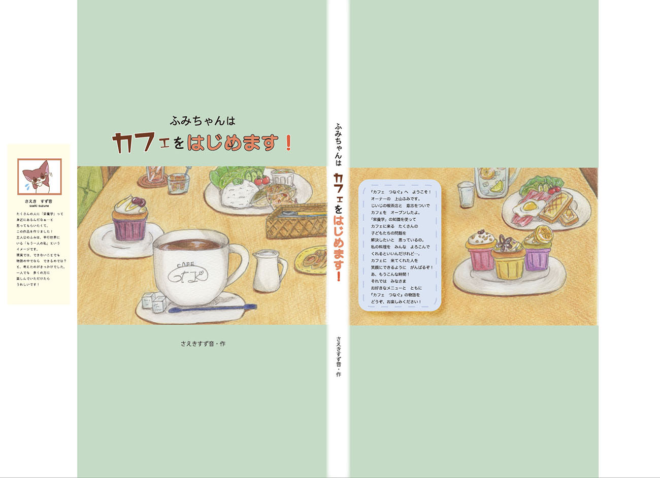 ただ読むだけでなく、再現レシピを家族や周りの人と一緒に作ることで、より身近に感じて欲しいと考えました。そのため、カバーを外した表紙には物語に出てくるカップケーキのレシピを載せ、ノベルティーとして『カフェ つなぐ』で使用しているコースターを作りました。