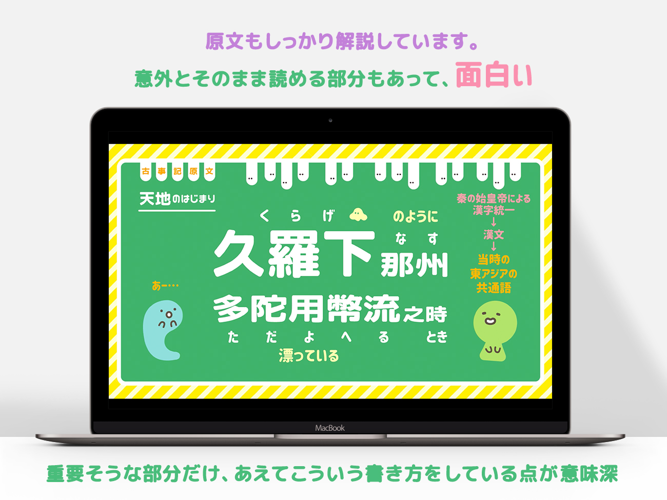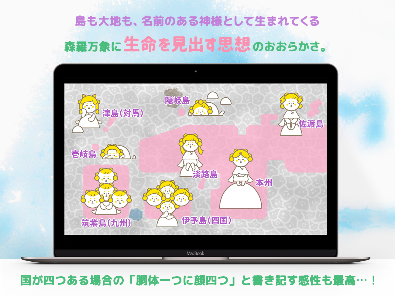 研究や解釈は様々ですが、すべてに意味があるため、ときにはツッコミを入れたりしながら、色々と想像したり、おおらかに楽しんでいただきたいです(わりと古事記の内容は、原始的で粗野な部分もあり、ツッコミどころも満載です)。