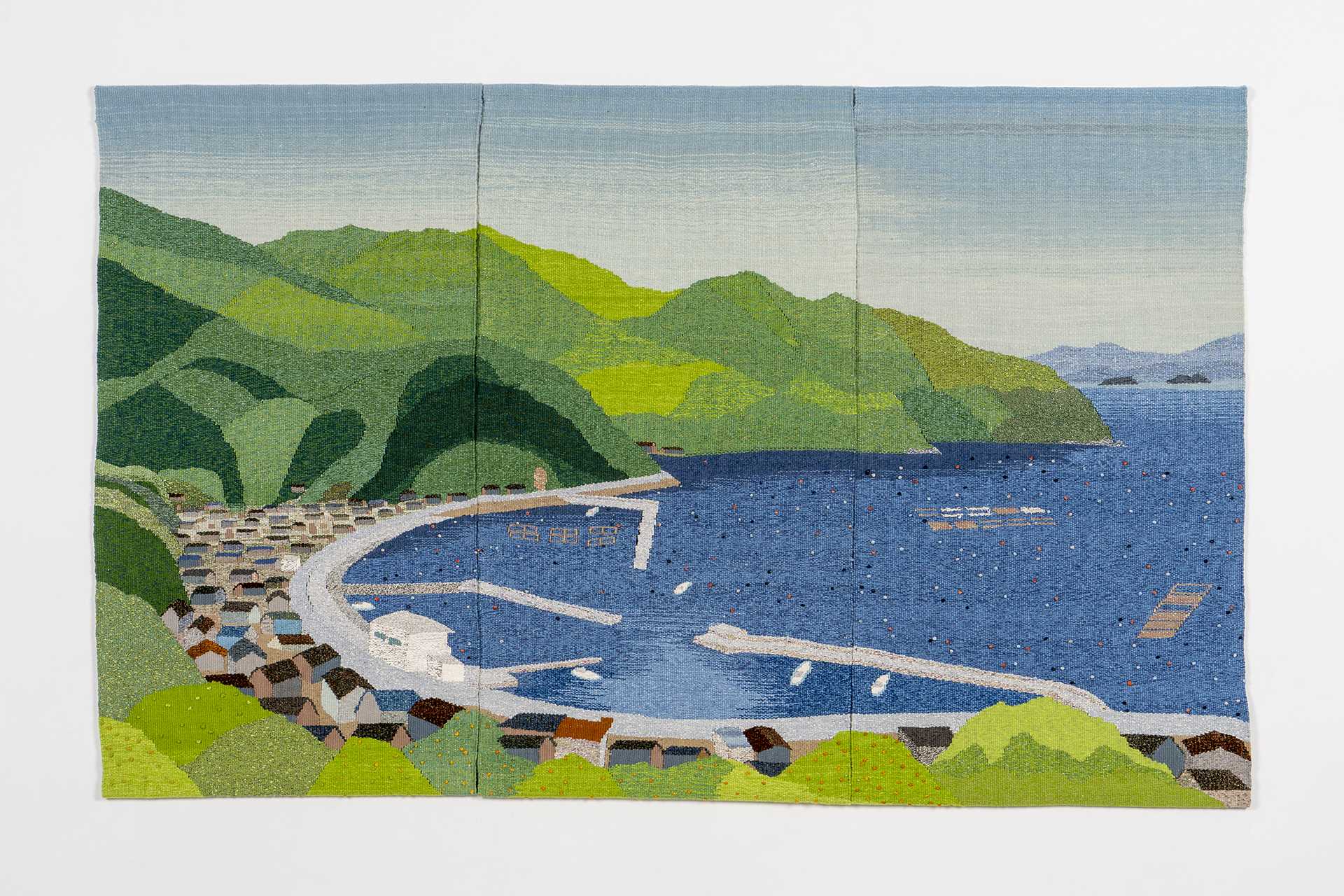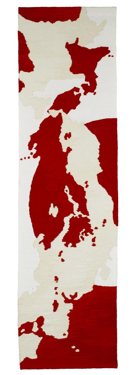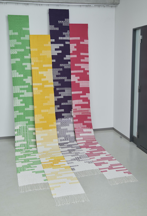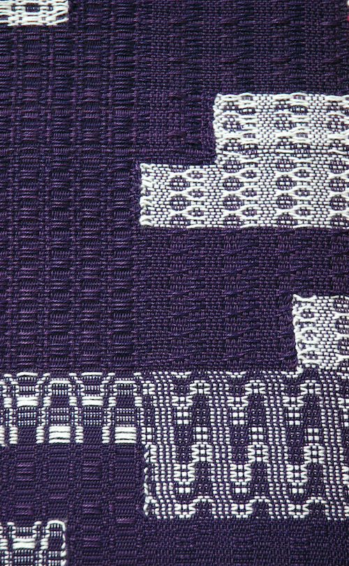 綜絖、タイアップ、足の踏み順の組み合わせにより様々な表情を見せる組織織。372種類をパッチワークのように組み合わせました。経絣と返し織により、白から色が立ちのぼる様子を表現しています。また、色彩部分は濃淡2色を交互に経糸にも緯糸にも使用することにより単調にならないように工夫しました。