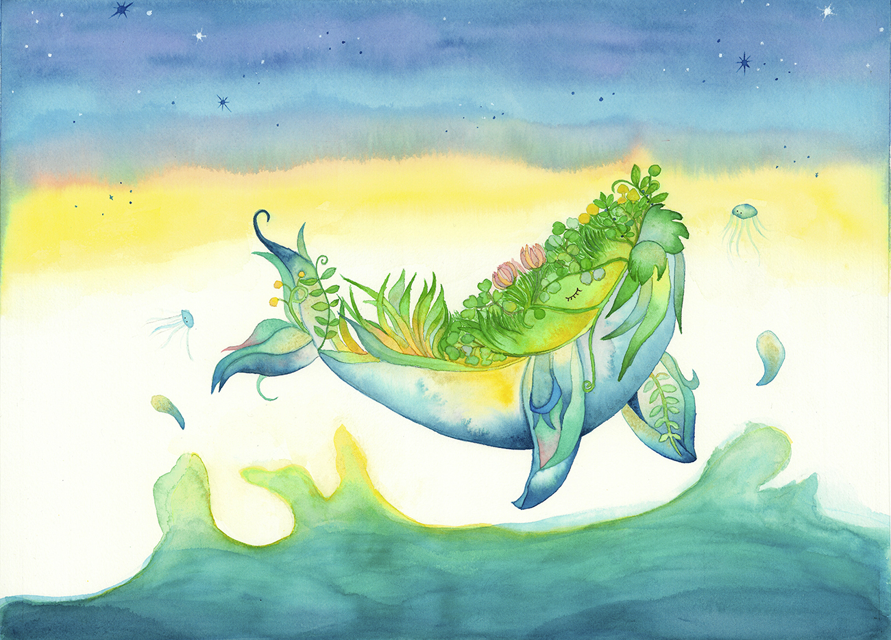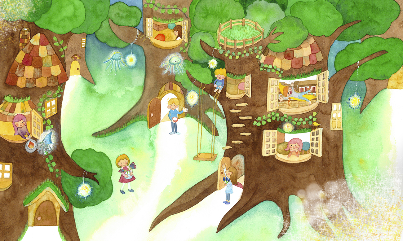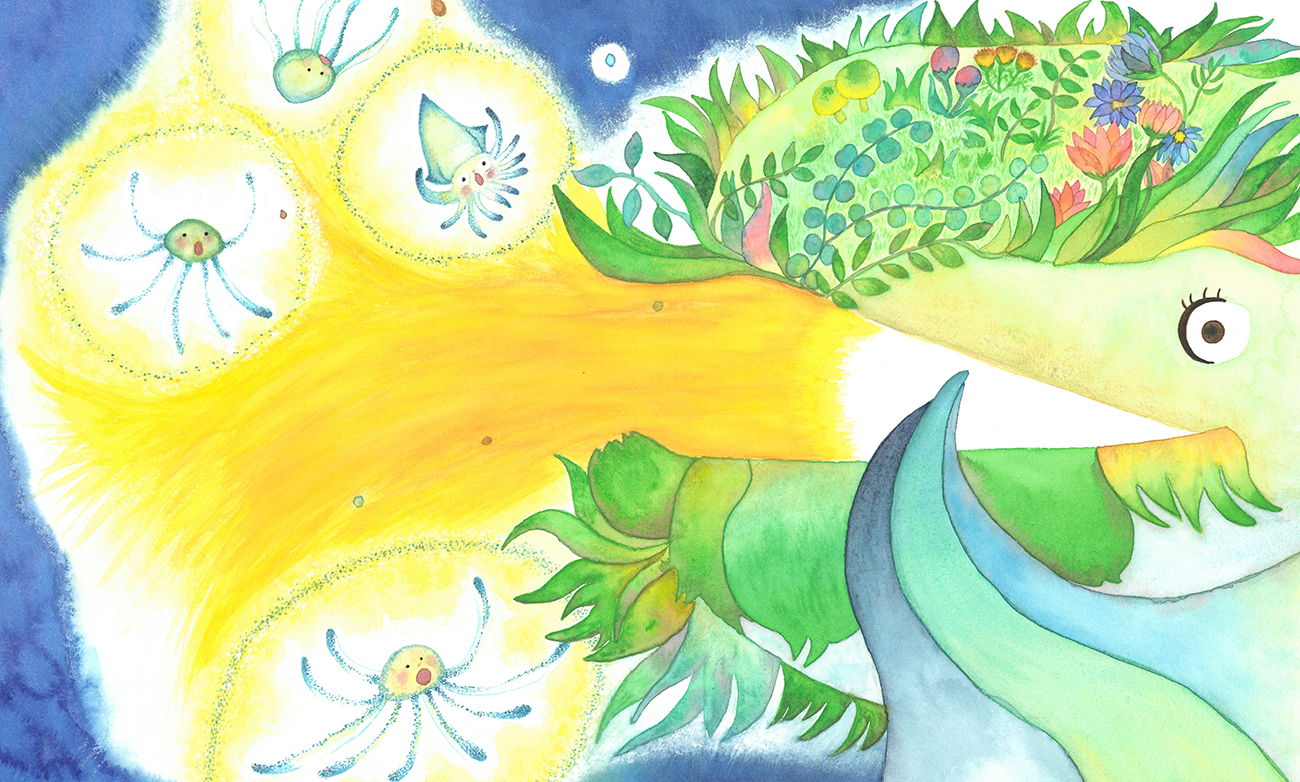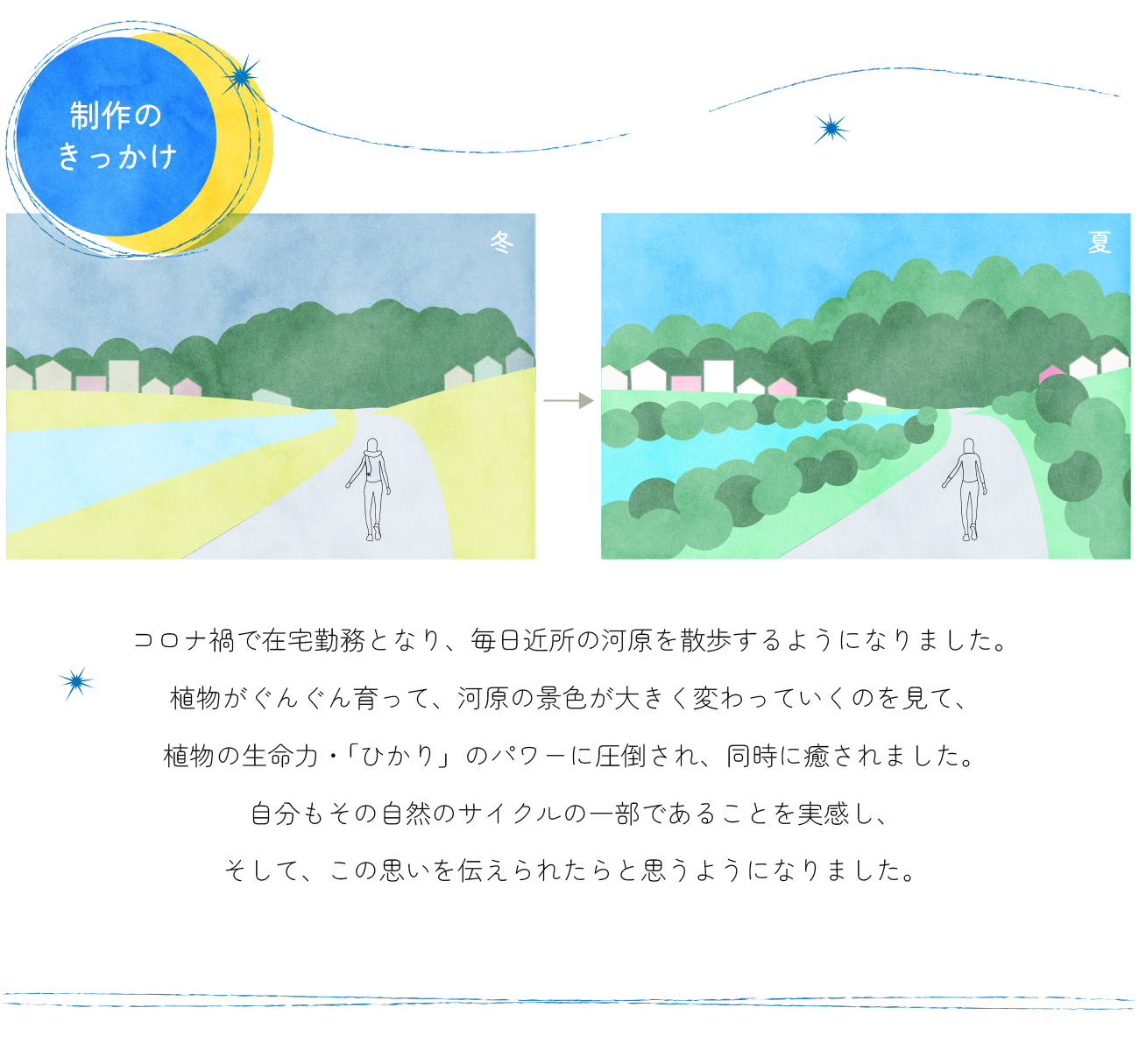 本作では、生命の源である「ひかり」の大切さを伝え、地球の美しさを実感することで、現在の社会の(戦争・コロナなどの)閉塞感を吹き飛ばしてほしいという思いを込めました。ファンタジーと水彩のにじみの世界に浸って、森で「ひかり」を浴びるように、癒しを感じてもらえたら幸いです。