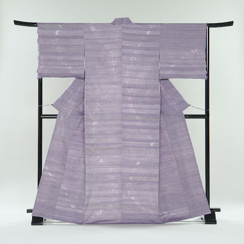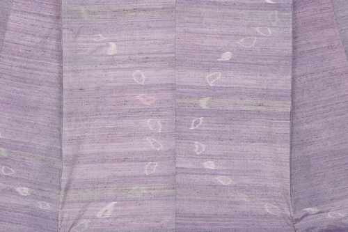 花びら染めに出会い、椿、すみれ、つつじ、杜若‥‥多様な色彩に魅了された。経糸の椿の花びら染めは儚く、時を経て薄いピンクグレーとなっていく。ずらし緯絣で表現した花びらと織り重なった緯糸のログウッドの紫の変化をゆっくり楽しみたい。自然の恵みに感謝。