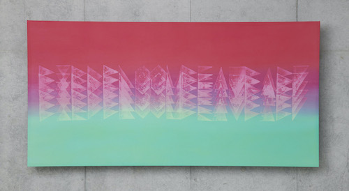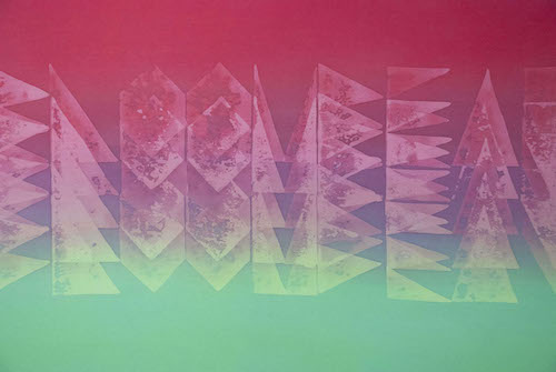 自作のフォントを用いた押捺版を作成して型ろう技法と反応染料のグラデーションを組み合わせて色の層を作った。