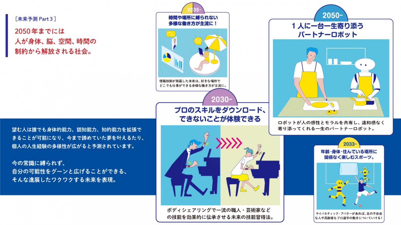 望む人は誰でも身体的能力、認知能力、知的能力を拡張できることが可能になり、今まで諦めていた夢を叶えることができたり、個人の人生経験の多様性が広がると予測されています。