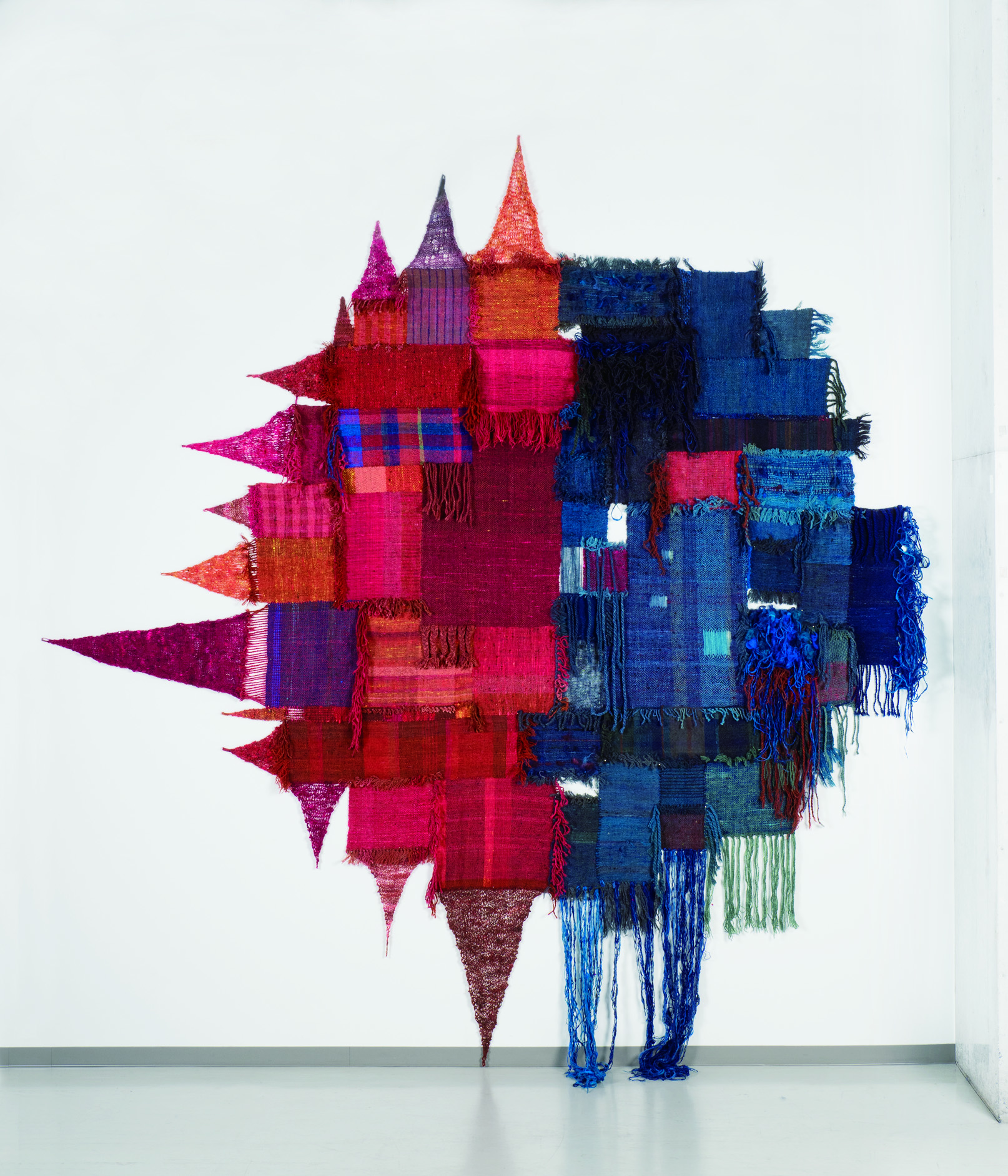 「茜さす」は日や光等にかかる枕詞です。夕焼けを思い浮かべる現代とは異なり、万葉の人々は茜色に朝日の色を連想したとあります。私も同様に、墨色の中に映える茜色に明るく輝くこれからを感じたいという思いを込めました。規則的な格子に茜色が不規則に加わることで、モノトーンへの拘りにとらわれず、新しい景色を見つけることができました。