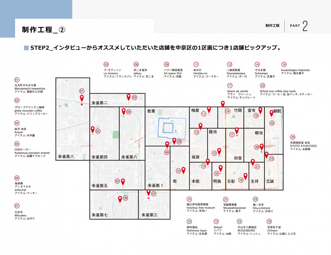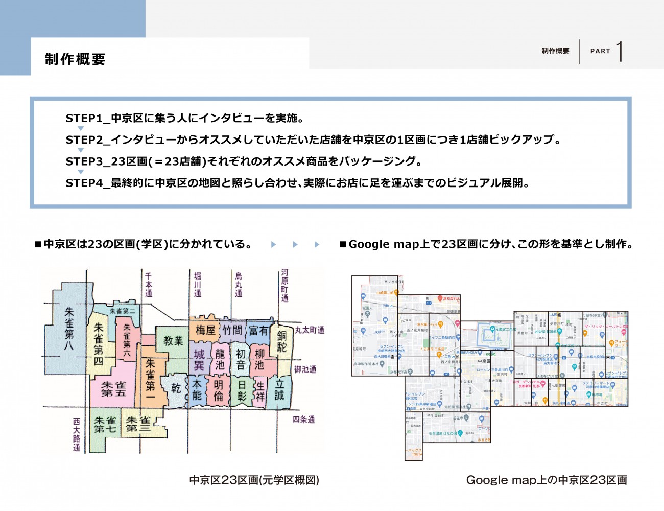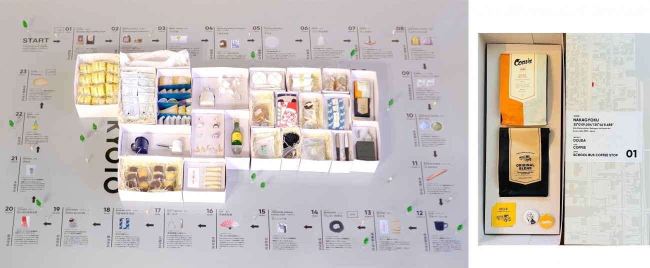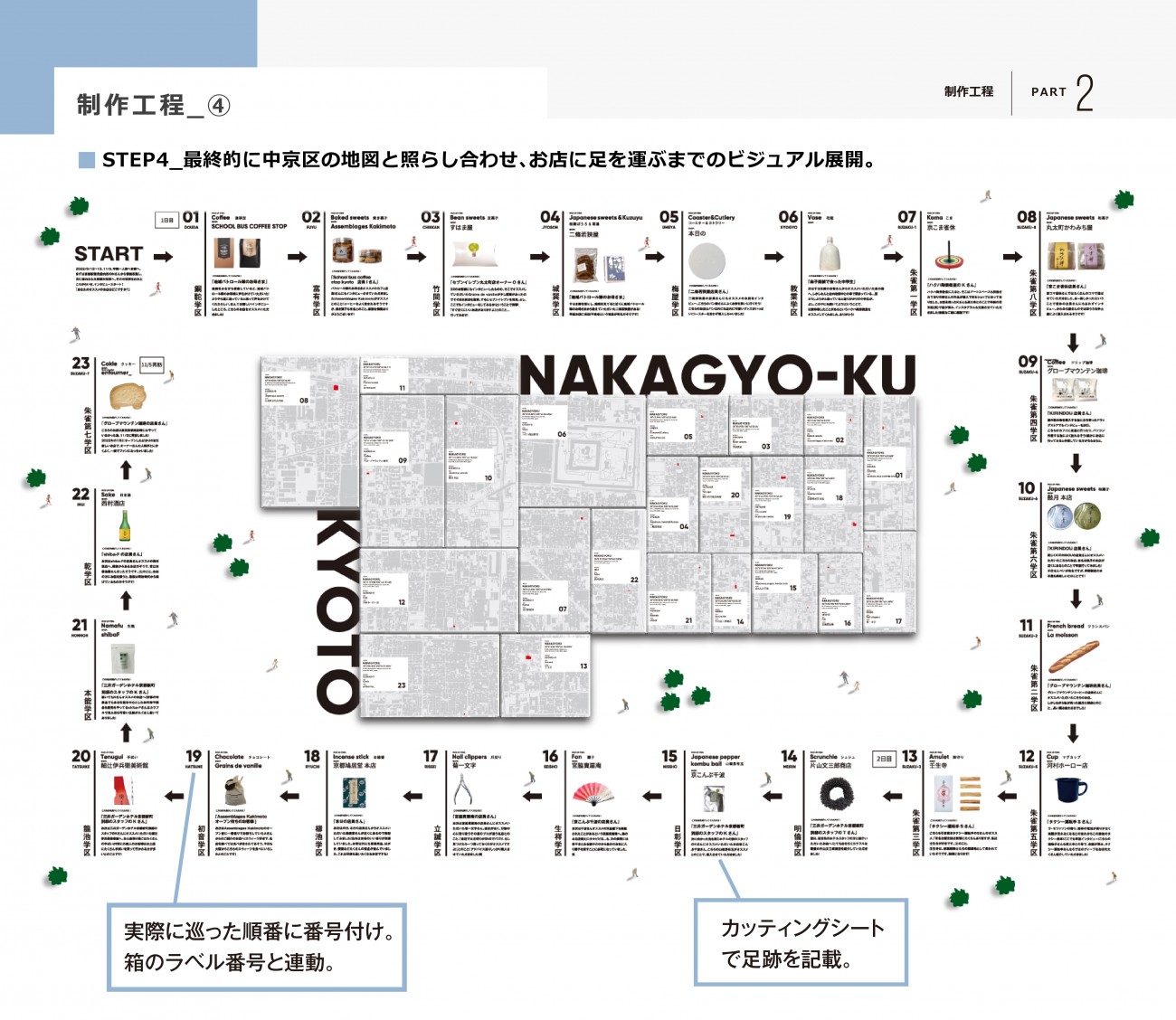 パッケージに中京区の地図をデザインし、23区画の箱全て並べると中京区の地図が完成するパズルのような仕組み。