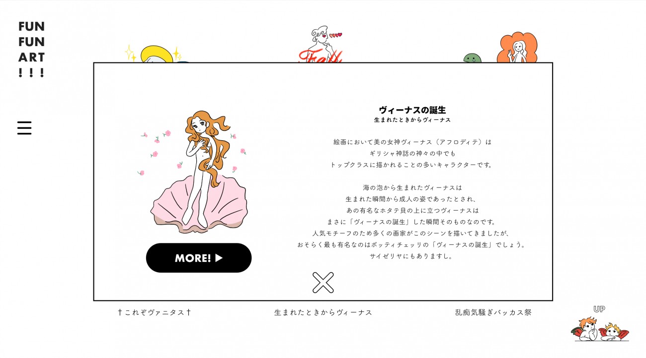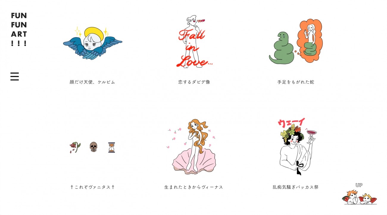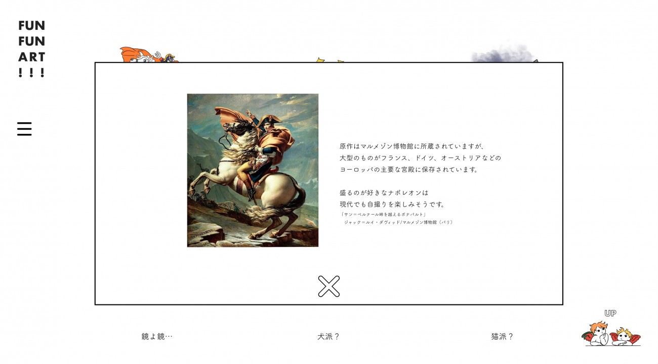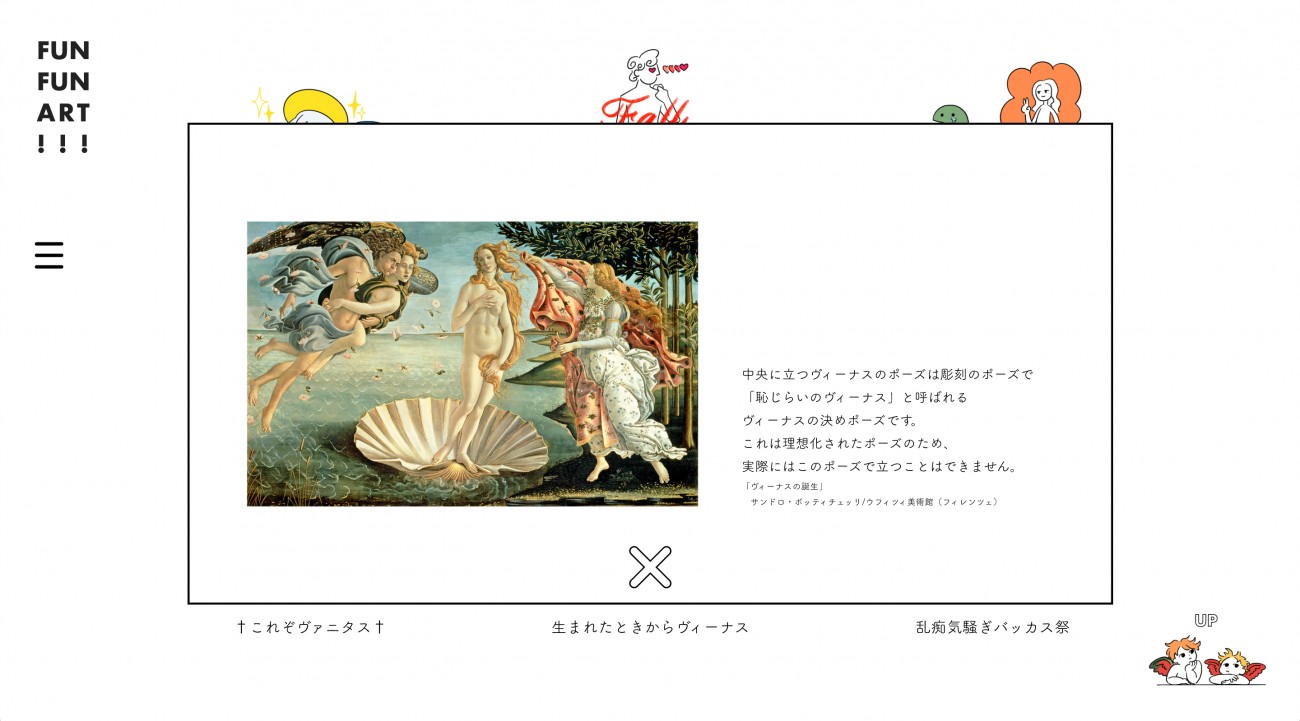 「FAN FAN ART !!!」は美術作品に関する小ネタなどを紹介するWEBサイトです。主なターゲットは10~30代の若年層で、今まで美術や芸術にあまり興味がない人でも面白いと思ってもらえるような、アートを好きになる小さなきっかけになるサイトを目指しました。多くの人が抱いている「真面目」で「お堅い」イメージからは少し離れて、気軽に楽しんでほしいと思い制作しています。