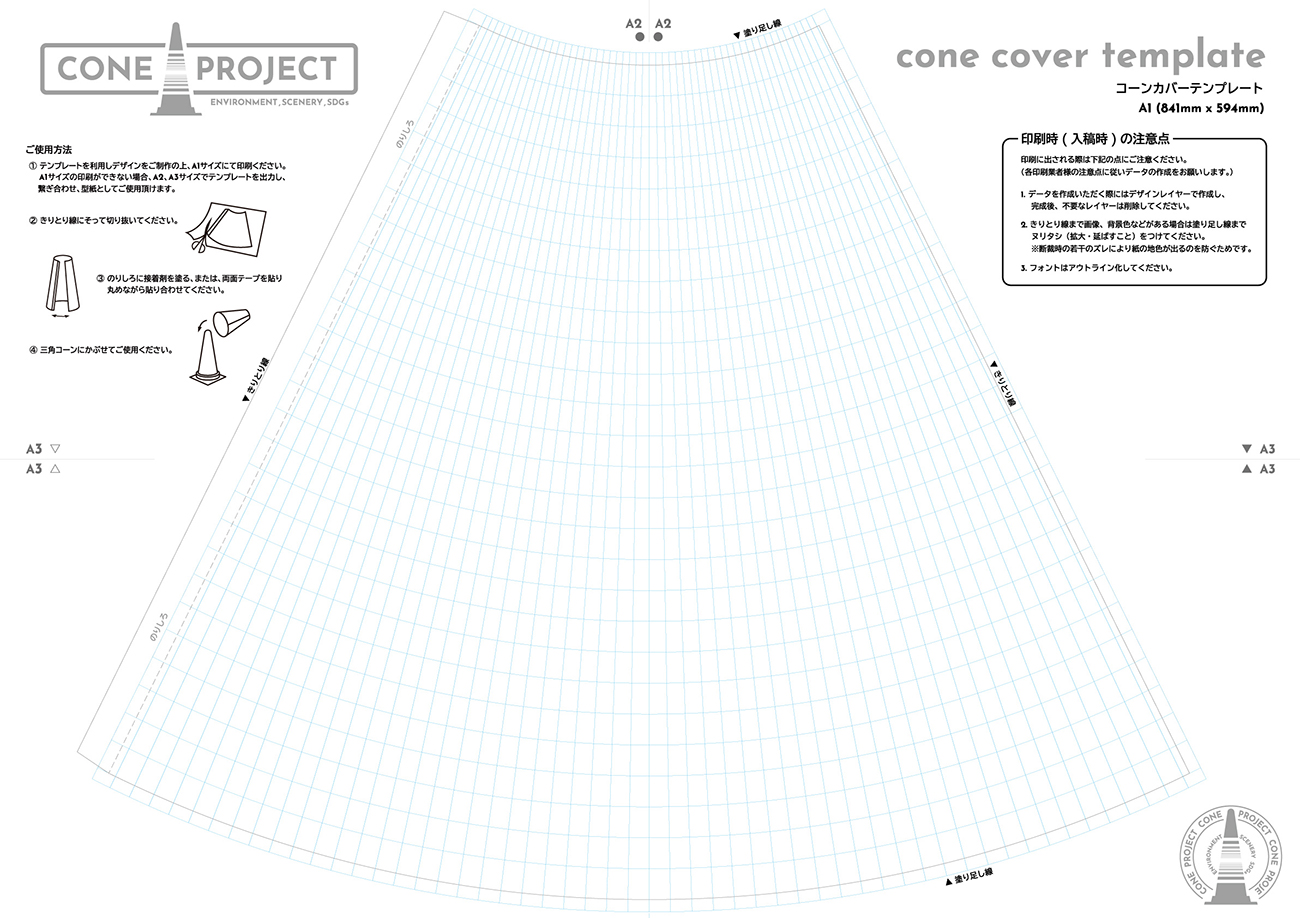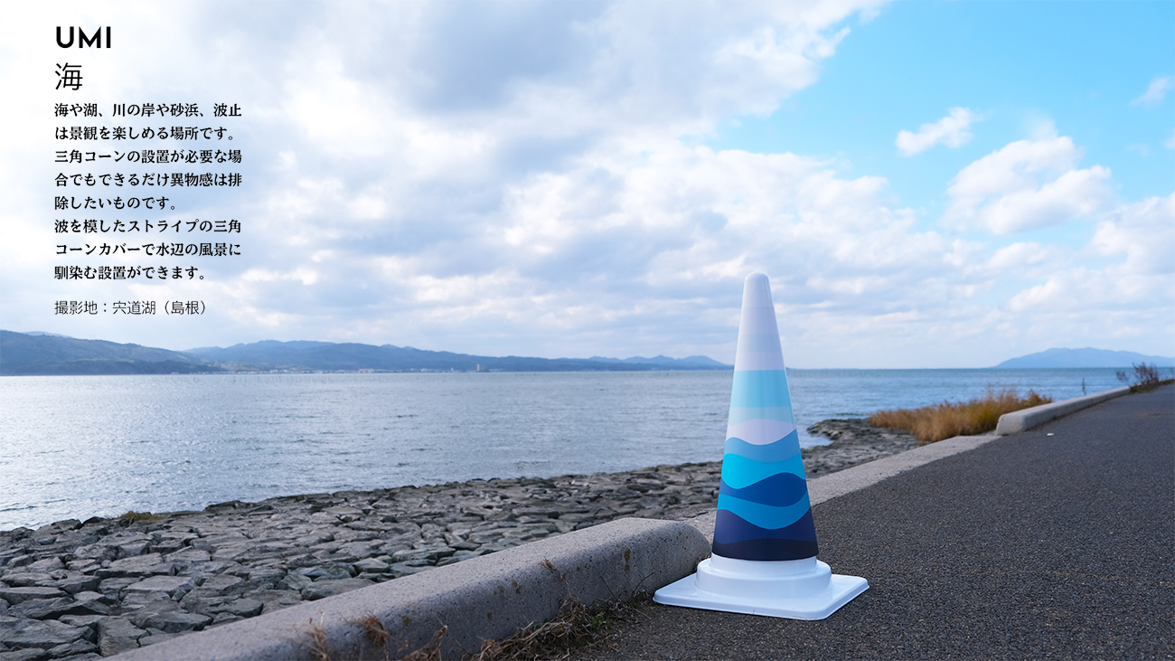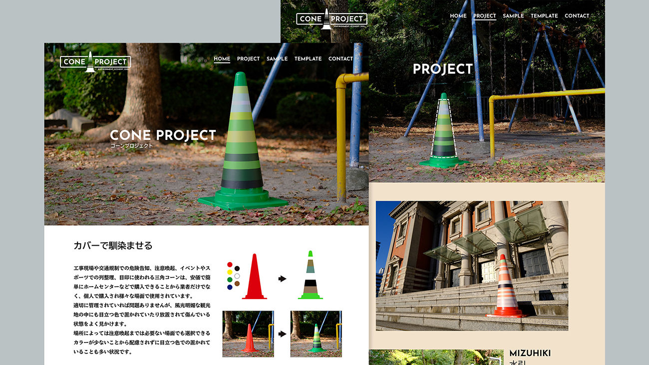 原色ほど目立たず、景色には溶け込みすぎないデザインのコーンカバーを取り付けることによって、誰にでもわかる三⾓形状のメッセージ性はそのままに、景観に配慮した設置ができるのではとの思いから、コーンカバーをデザインし、自分でも設置してみたい、作ってみたいと多くの方に感じていただけるようなウェブサイトを制作しました。
