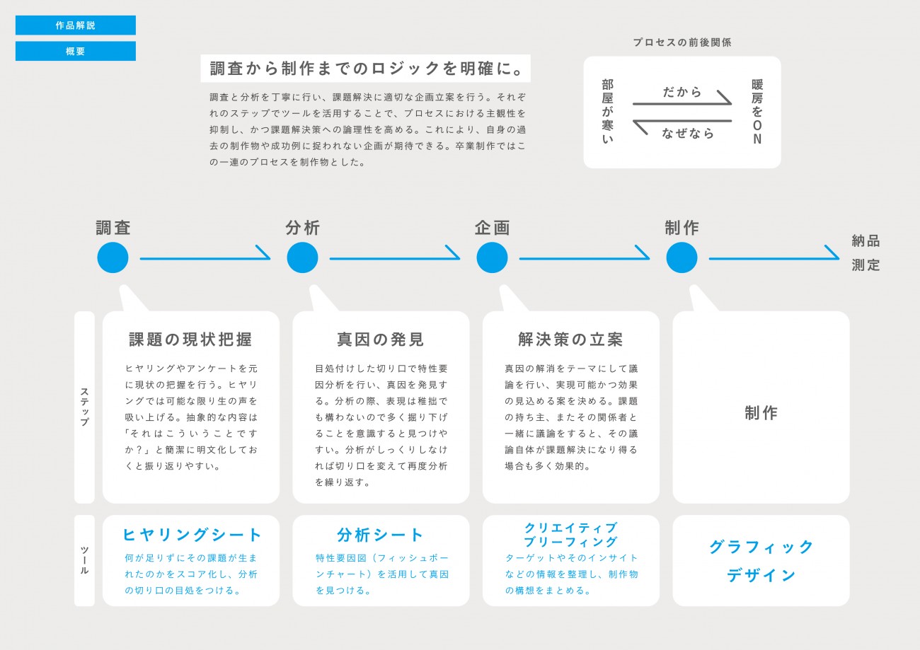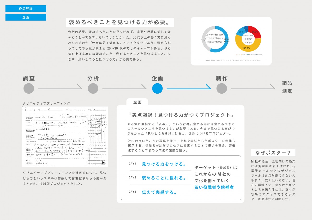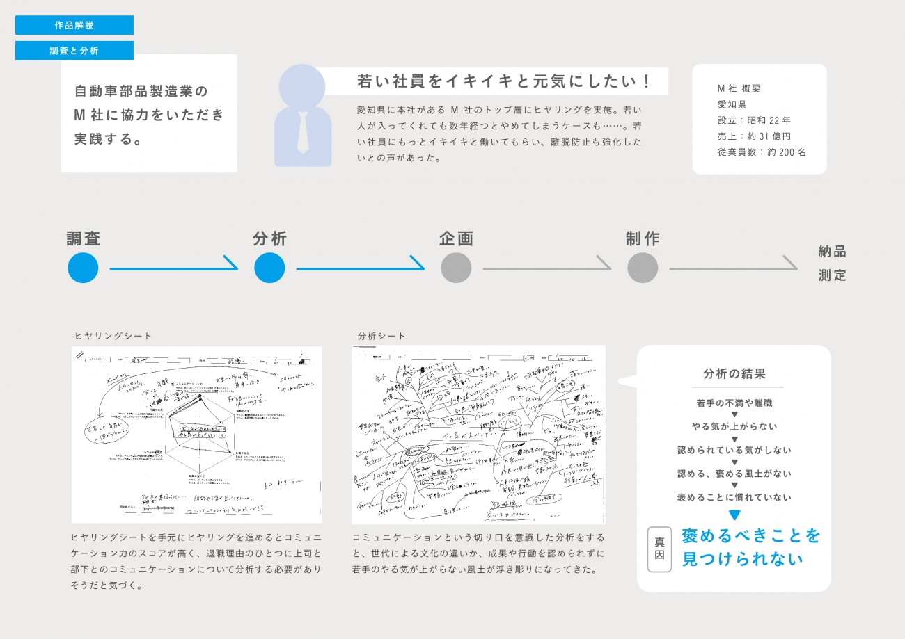 施すグラフィックデザインがただ「かっこいい」「おしゃれ」では、見た目は整ったとしても課題の解決に至るとは限らない。「なぜこのデザインなのか」の問いへのこたえに論理性を持たせることが解決に導く為には必要であると考え、今回協力いただいたM社を活動フィールドとし、ヒトに関する課題の分析から、プロジェクトの企画、制作を行った。