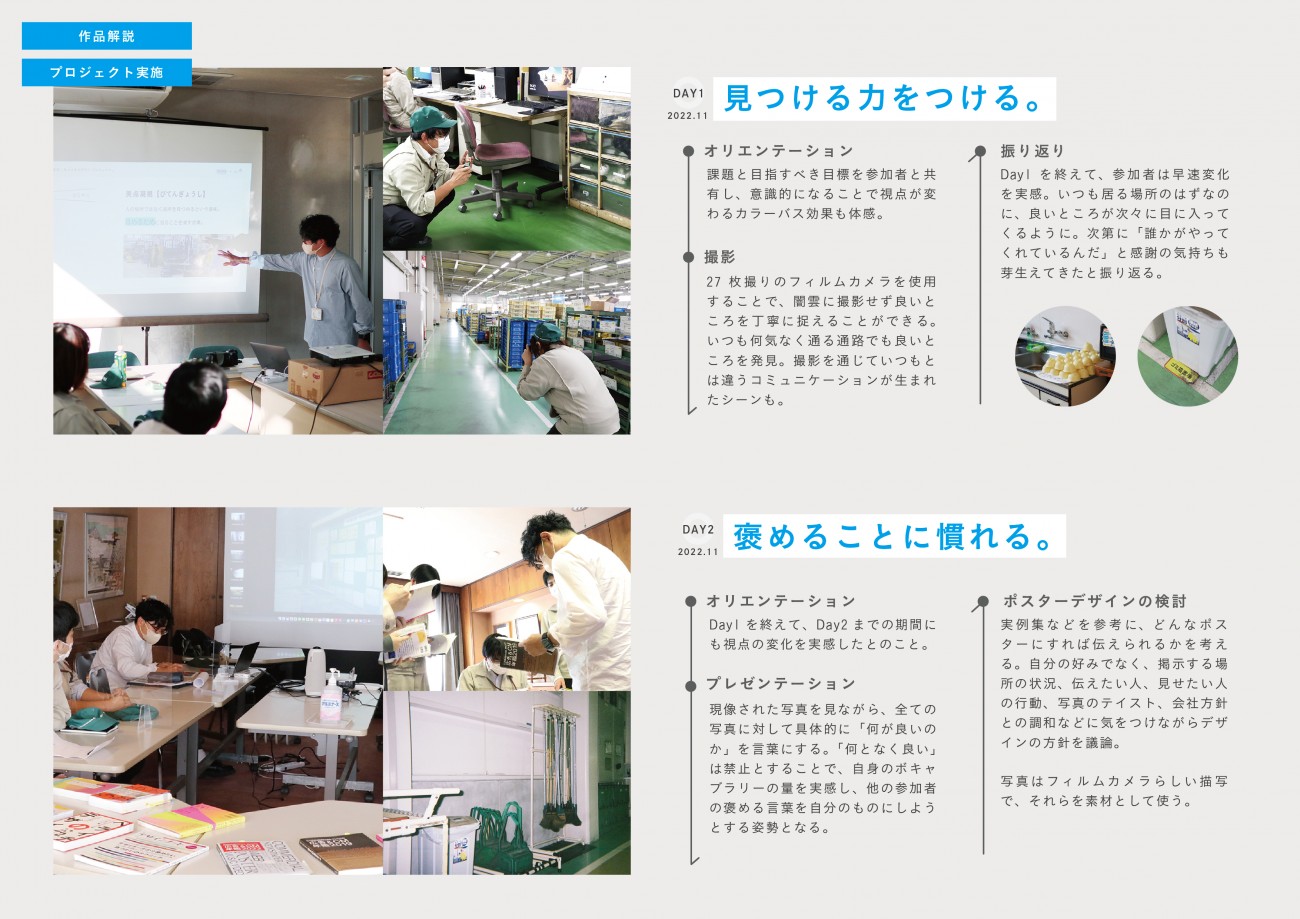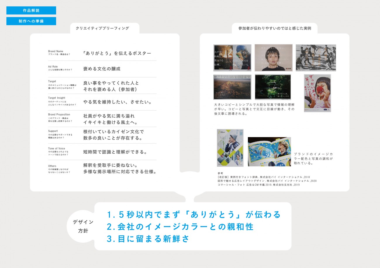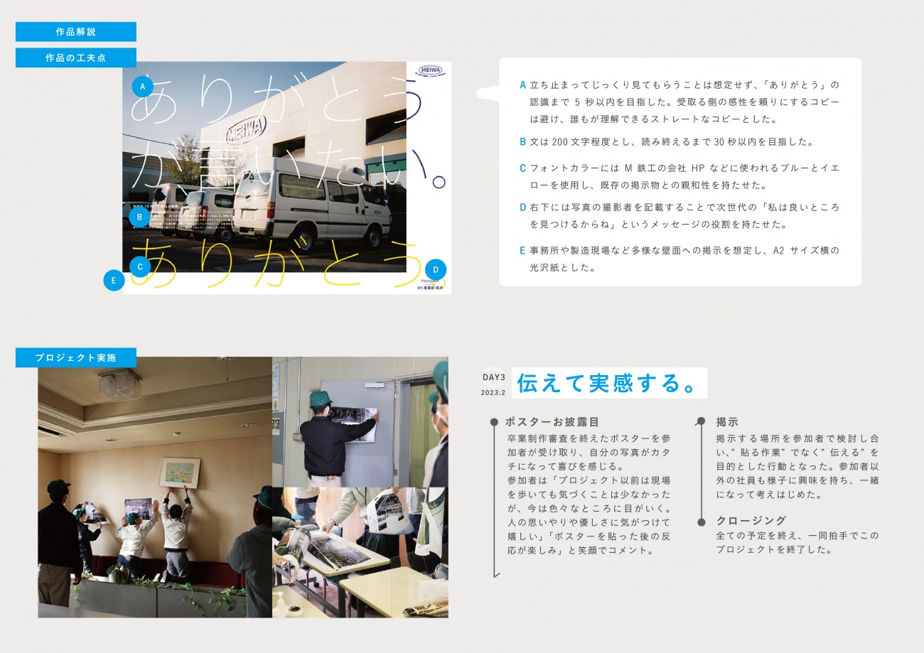 施すグラフィックデザインがただ「かっこいい」「おしゃれ」では、見た目は整ったとしても課題の解決に至るとは限らない。「なぜこのデザインなのか」の問いへのこたえに論理性を持たせることが解決に導く為には必要であると考え、今回協力いただいたM社を活動フィールドとし、ヒトに関する課題の分析から、プロジェクトの企画、制作を行った。