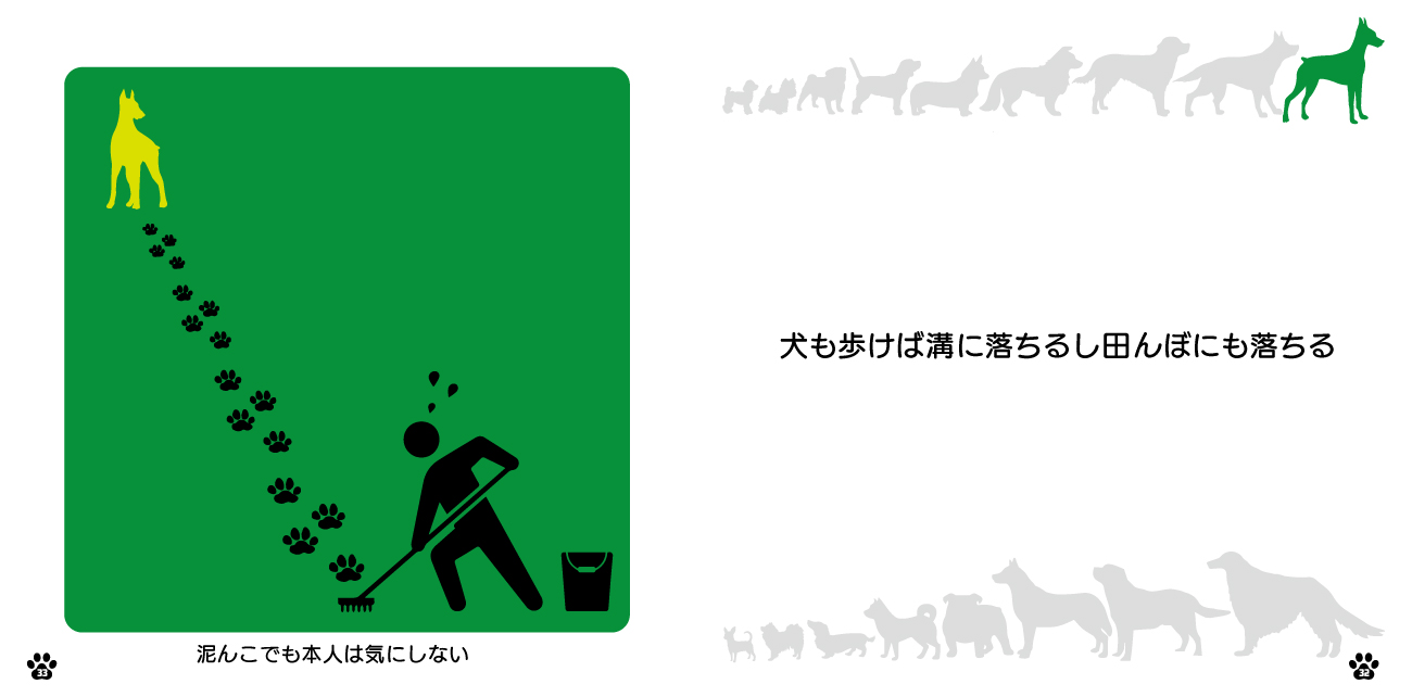 イヌは毛並などで種を区分する必要があるためピクトグラムではなくシルエットで表現。