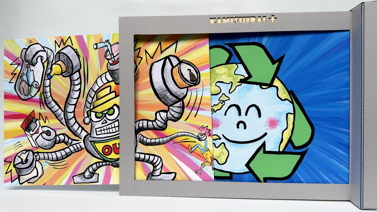 携帯できるカラフル段ボールを使用。内箱に三角形の脚を挿すことで紙芝居になる。