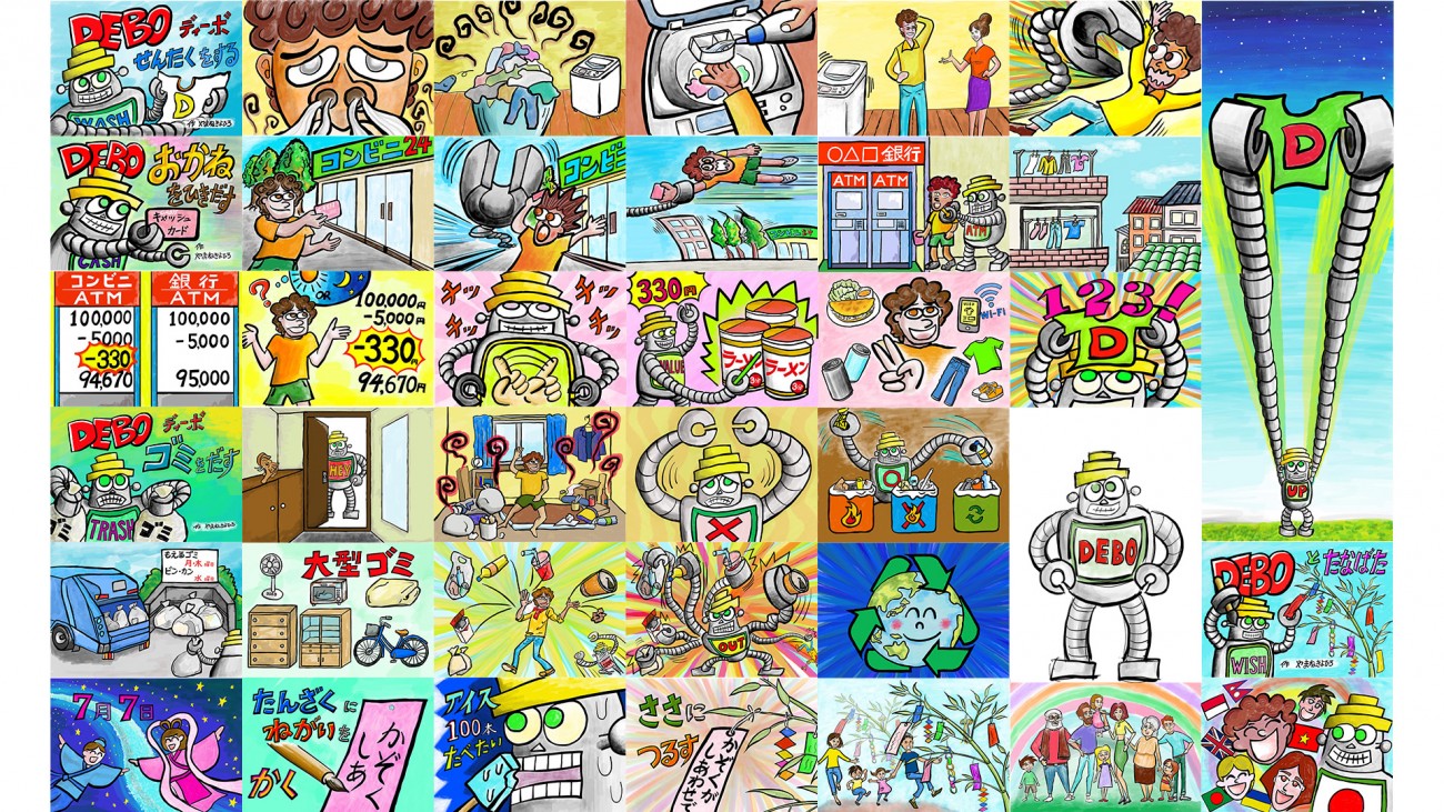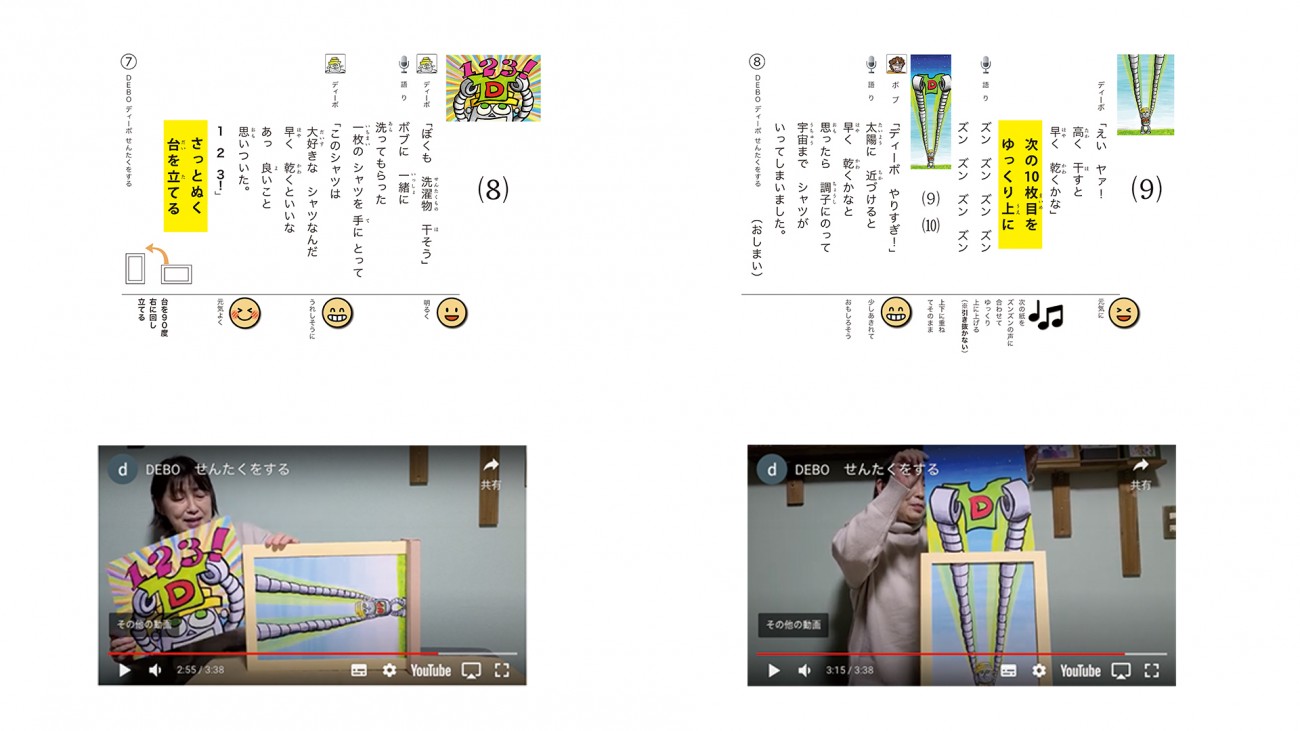 図版や絵の魅力で情報を伝達するピクトグラムやデジタルデザインが主流の中、絵と分かりやすい言葉で構成され、演者の話術で理解度を押し図りながら進められる参加型紙芝居は、複数名で見る時に起きる共感と相まって記憶に留まると感じたからです。留学生から聞き取りを行い、特に困っている「身だしなみと洗濯」「お金に関すること」「ゴミの出し方」の3点をテーマとした3作品と「七夕」行事の楽しみ方を伝える1作品の全4話を制作しました。しかし各所で演じてもらうには、演者が少なく、誰にでも簡単に演じることは難しいという問題もありました。