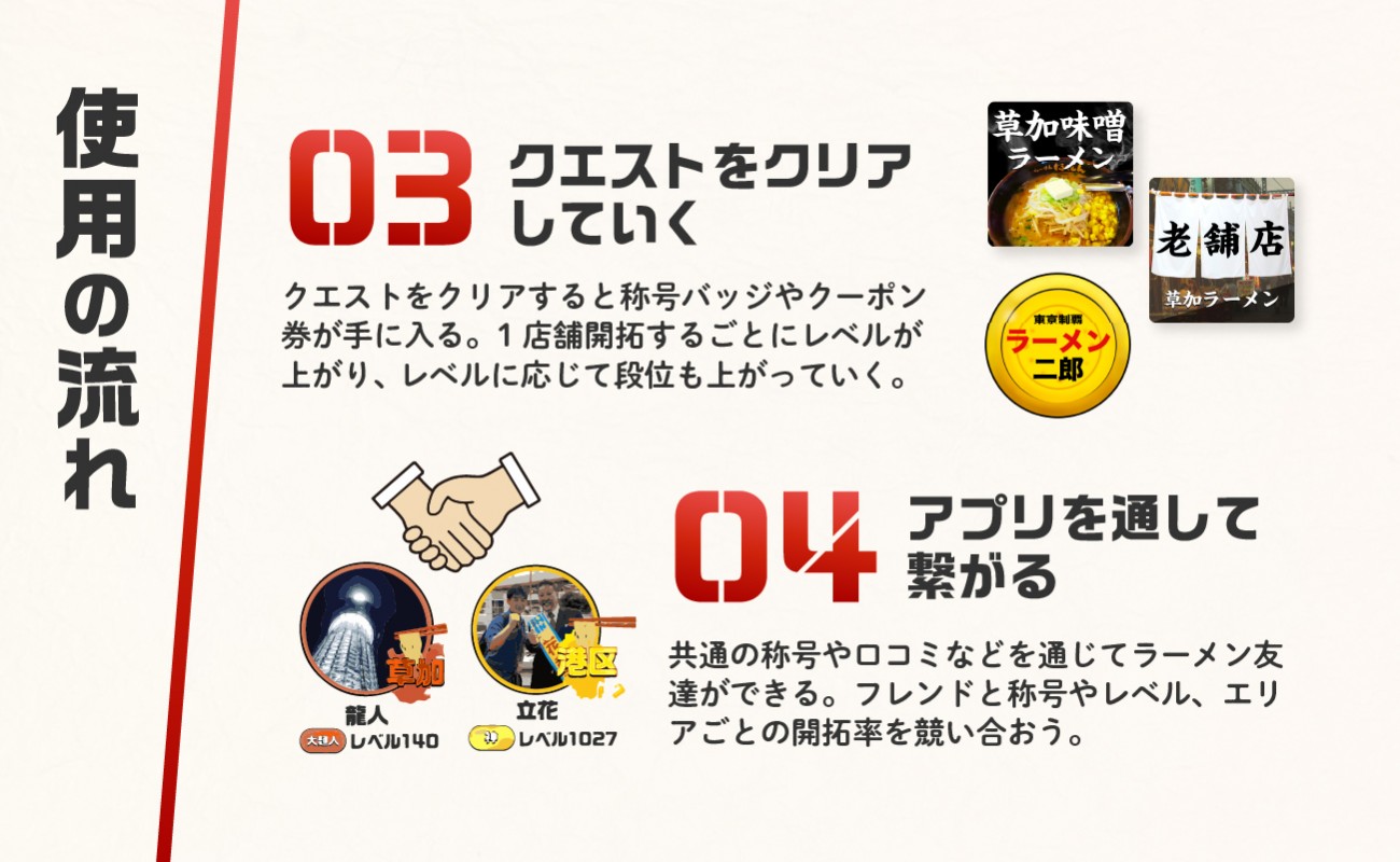クエストや称号、口コミ投稿を通じてアプリ内で沢山のラーメン好きな人と繋がり、ラーメンについてコミニュケーションを取ってみたり、ラーメンの情報をシェアしてみたりも出来ます。