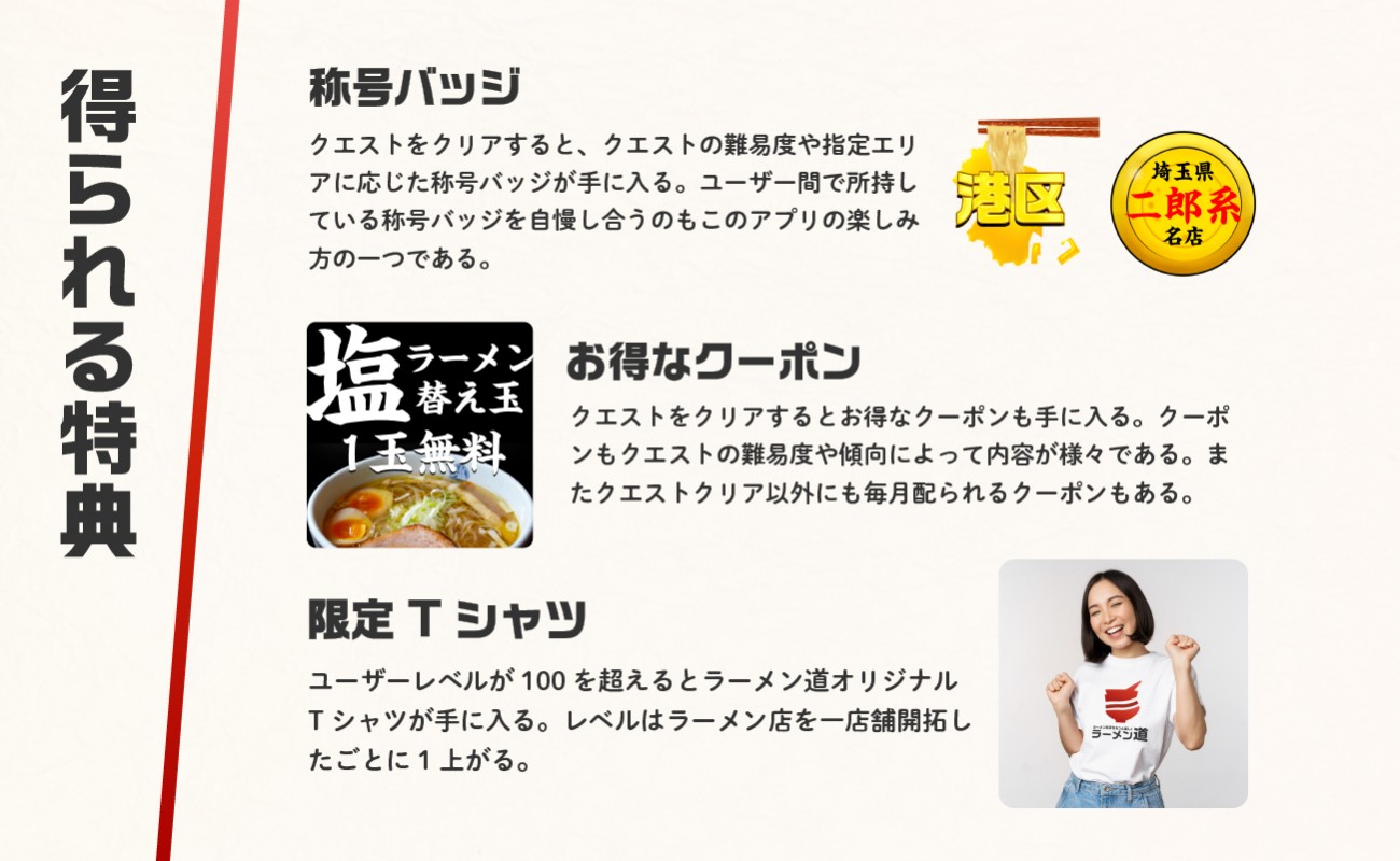 アプリ内には複数のクエストが存在し、各クエストに該当するラーメン屋を開拓していくことにより、クエスト内のスタンプが貯まっていきます。