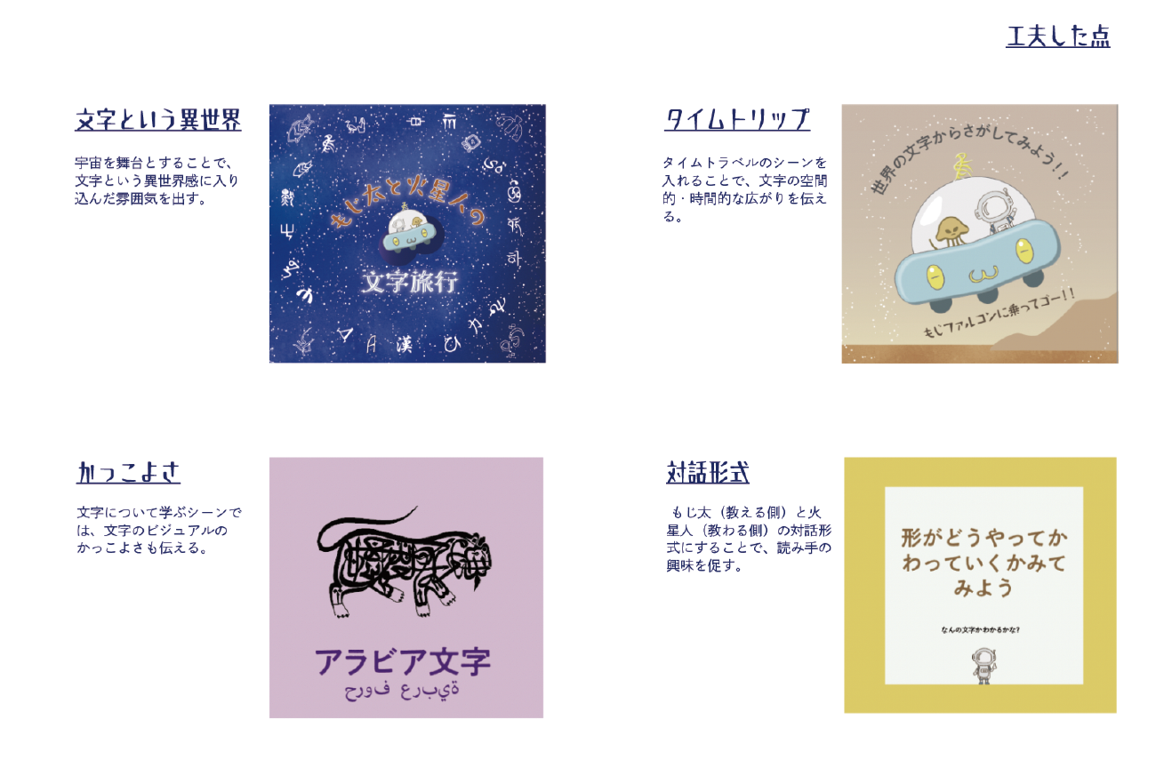 文字の魅力を「成り立ちの面白さ」、「造形の美しさ」という2つの側面からとらえ、文字にあまり興味がなくてもその魅力が伝わるように、主人公が文字を知らない宇宙人と、過去や未来にタイプトリップしながら学んでいくストーリーを考えた。この本を開いていただいた方に、文字の世界を少しでも楽しんでいただければ幸いである。